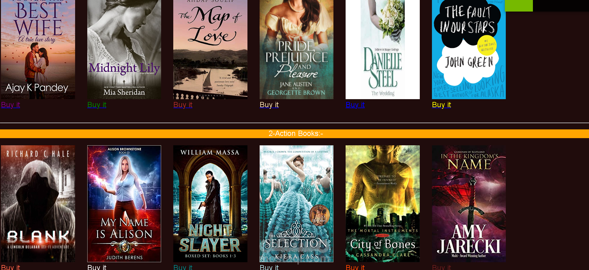 تحتوي على خلفية بلون داكن مع نصوص بيضاء، وعرض الكتب باستخدام جداول لعرض الصور مع الروابط المباشرة لشراء الكتب من أمازون.