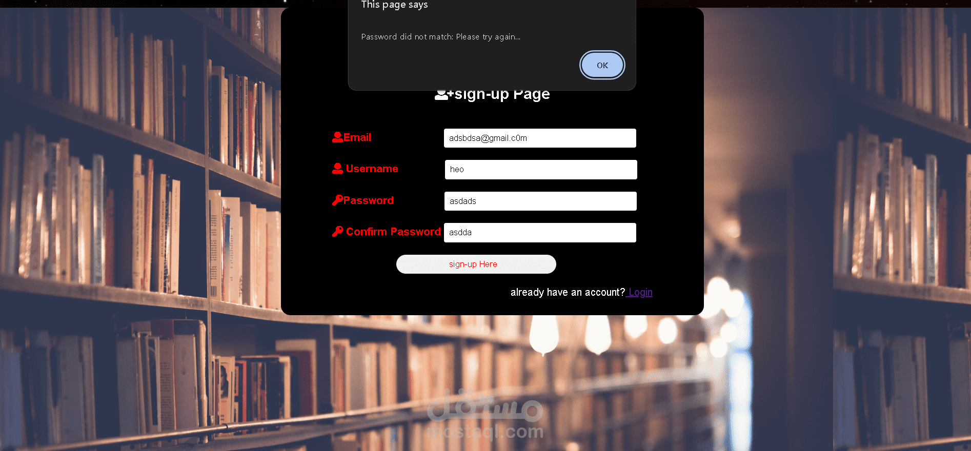 Each book has a clear cover image with a "Buy it" link to facilitate quick purchases. The website is organized into genres like romance and action, and it has sections to highlight different categories of books. The sign-up page includes fields for the user’s email, username, password, and confirmation, with an error message for mismatched passwords, ensuring secure account creation.