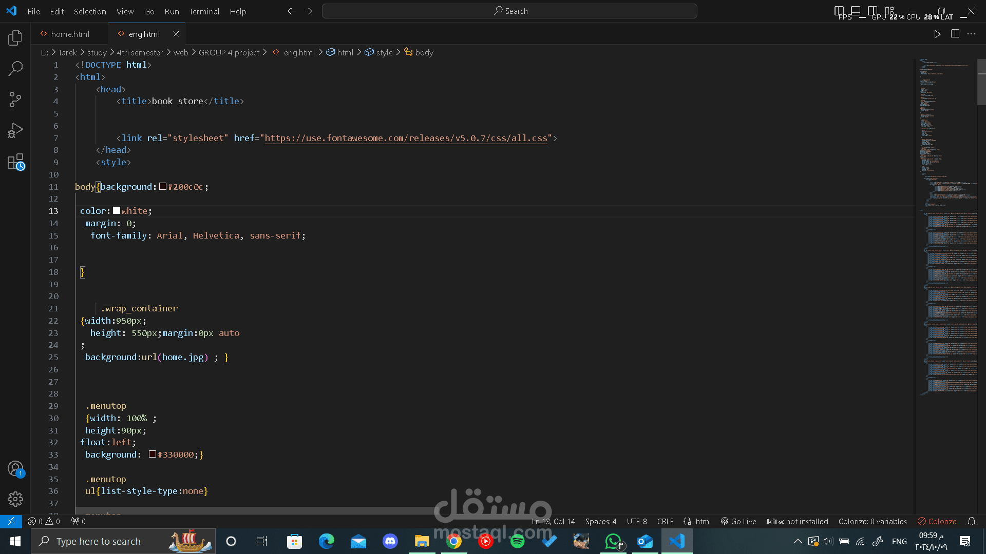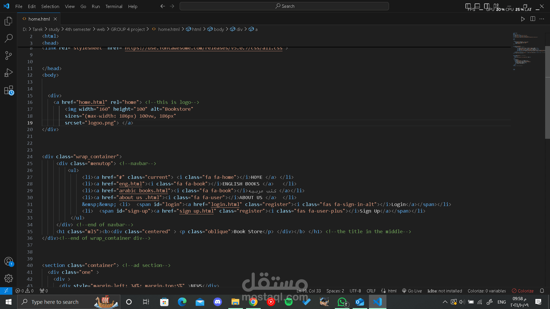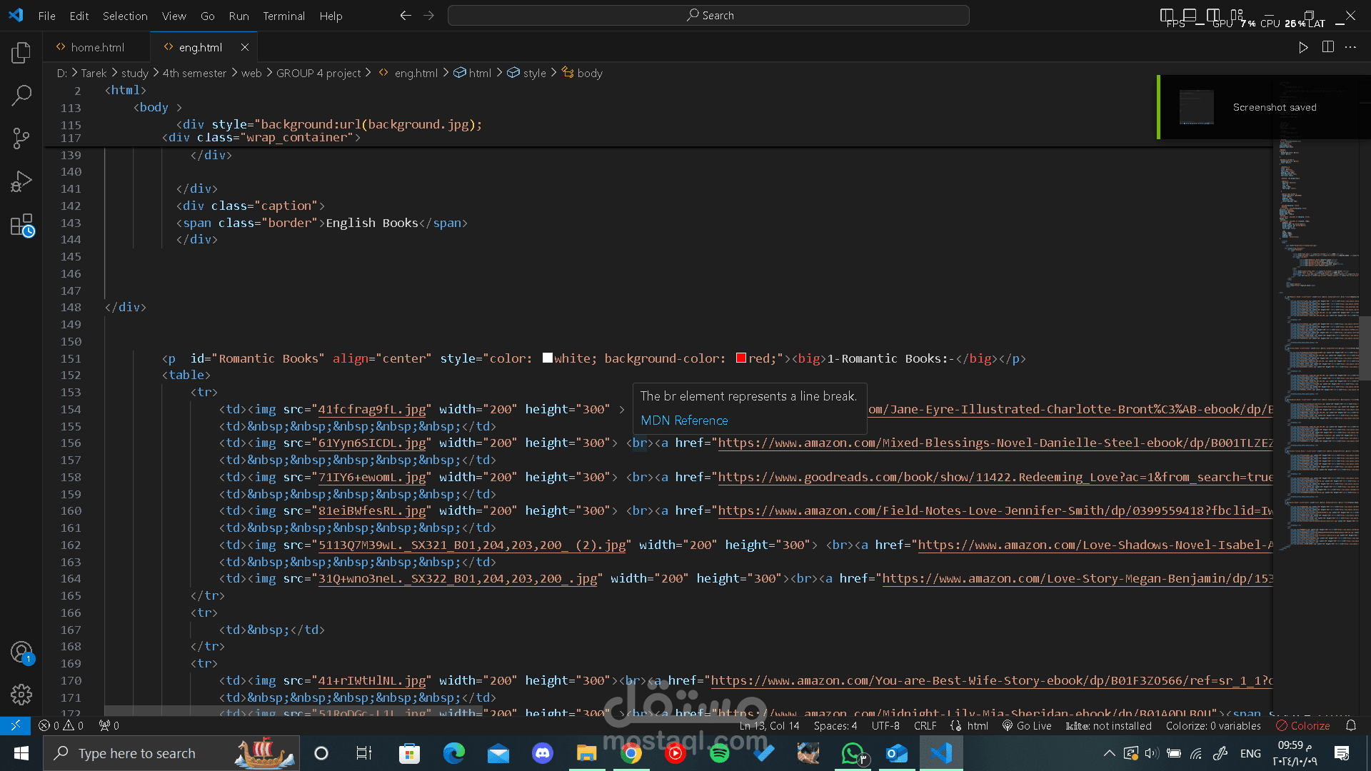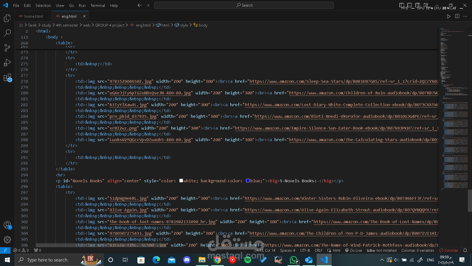 تم إرفاق لقطات من مشروعك داخل محرر Visual Studio Code، حيث يظهر الكود البرمجي لكل من الصفحة الرئيسية وصفحة الكتب الإنجليزية.