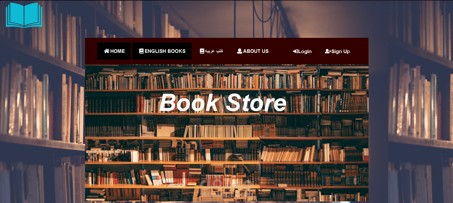 This website is an online bookstore designed with a user-friendly interface that features two main categories: English and Arabic books. The homepage displays a bookshelf background with a large “Book Store” heading to immediately capture the visitor's attention. The navigation bar at the top includes essential sections like Home, English Books, Arabic Books, About Us, Login, and Sign Up, making it easy for users to browse the site.
