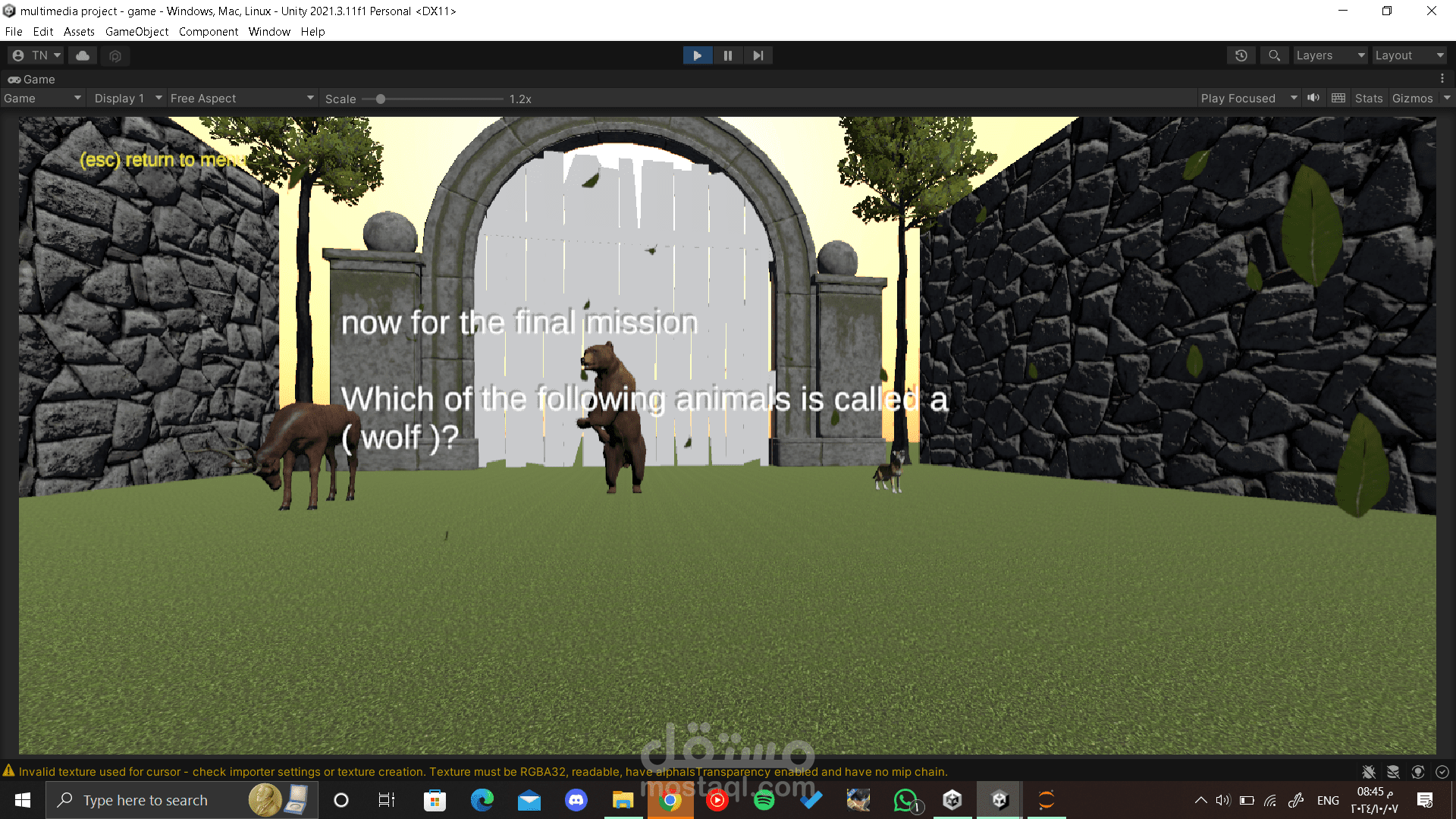 المكتبات والإضافات: تم استخدام مكتبات الرسوميات الافتراضية في Unity لإنشاء الرسوم المتحركة للحيوانات وتطوير المؤثرات البصرية التفاعلية.