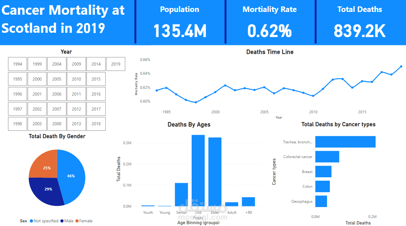 I created this Cancer Mortality Dashboard to analyze cancer deaths in Scotland for 2019. It features: Key Metrics: Mortality rate and total deaths.