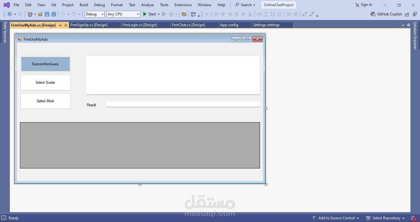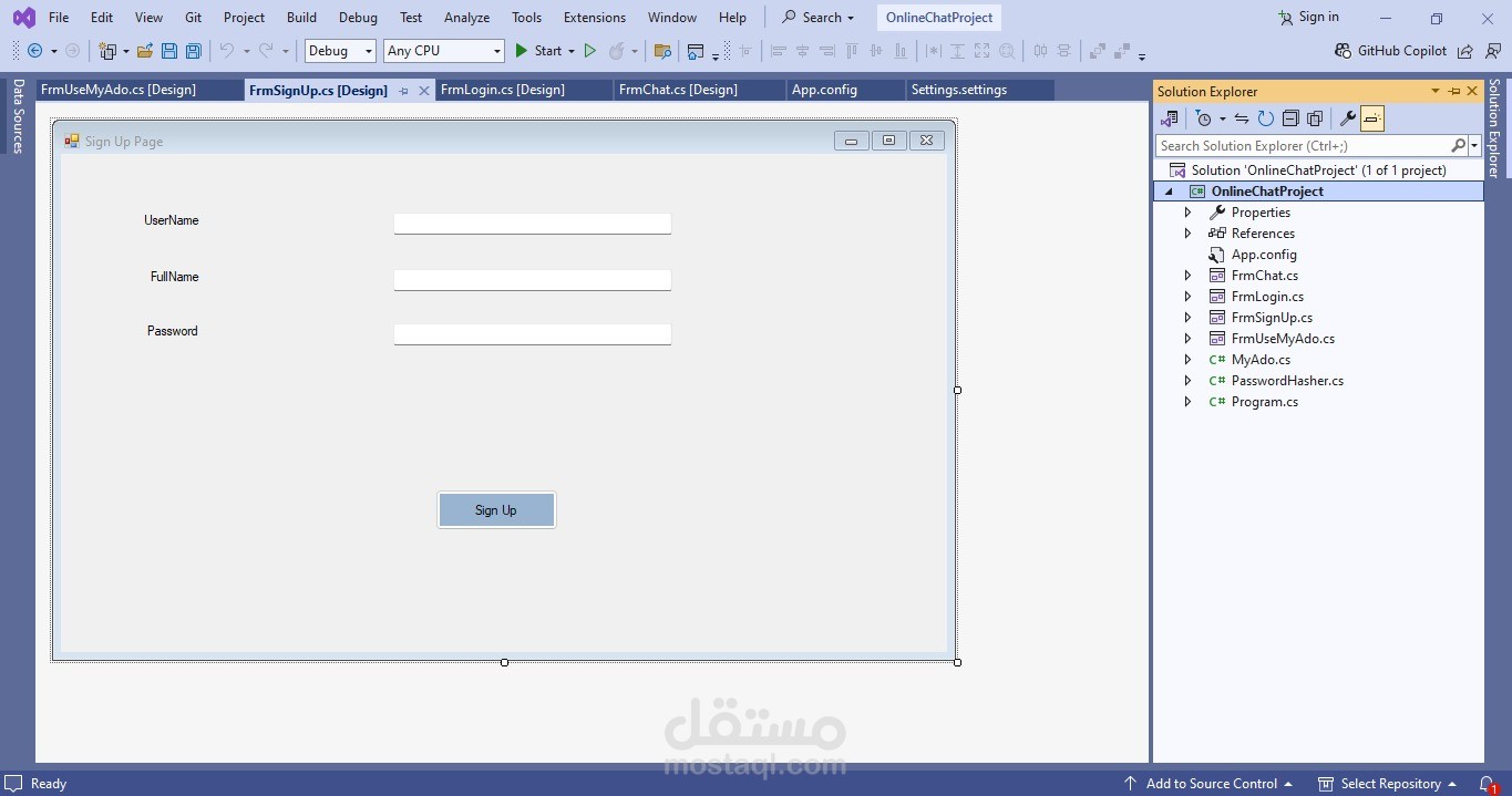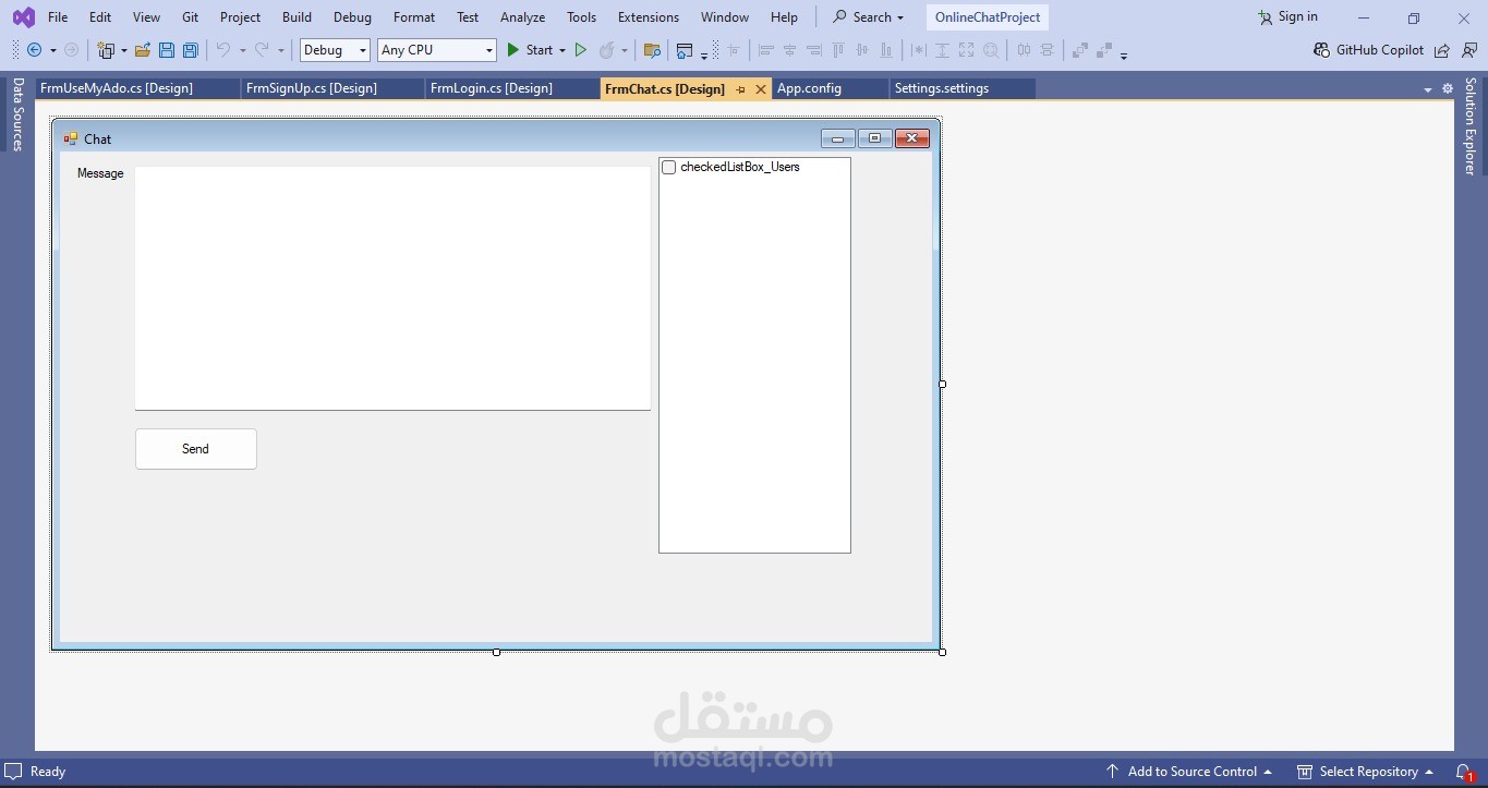 1.تصميم الواجهة الأمامية: تم استخدام WPF أو WinForms لإنشاء واجهة مستخدم سهلة الاستخدام ومرنة، مع دعم للمراسلات الفورية والتفاعل المباشر.