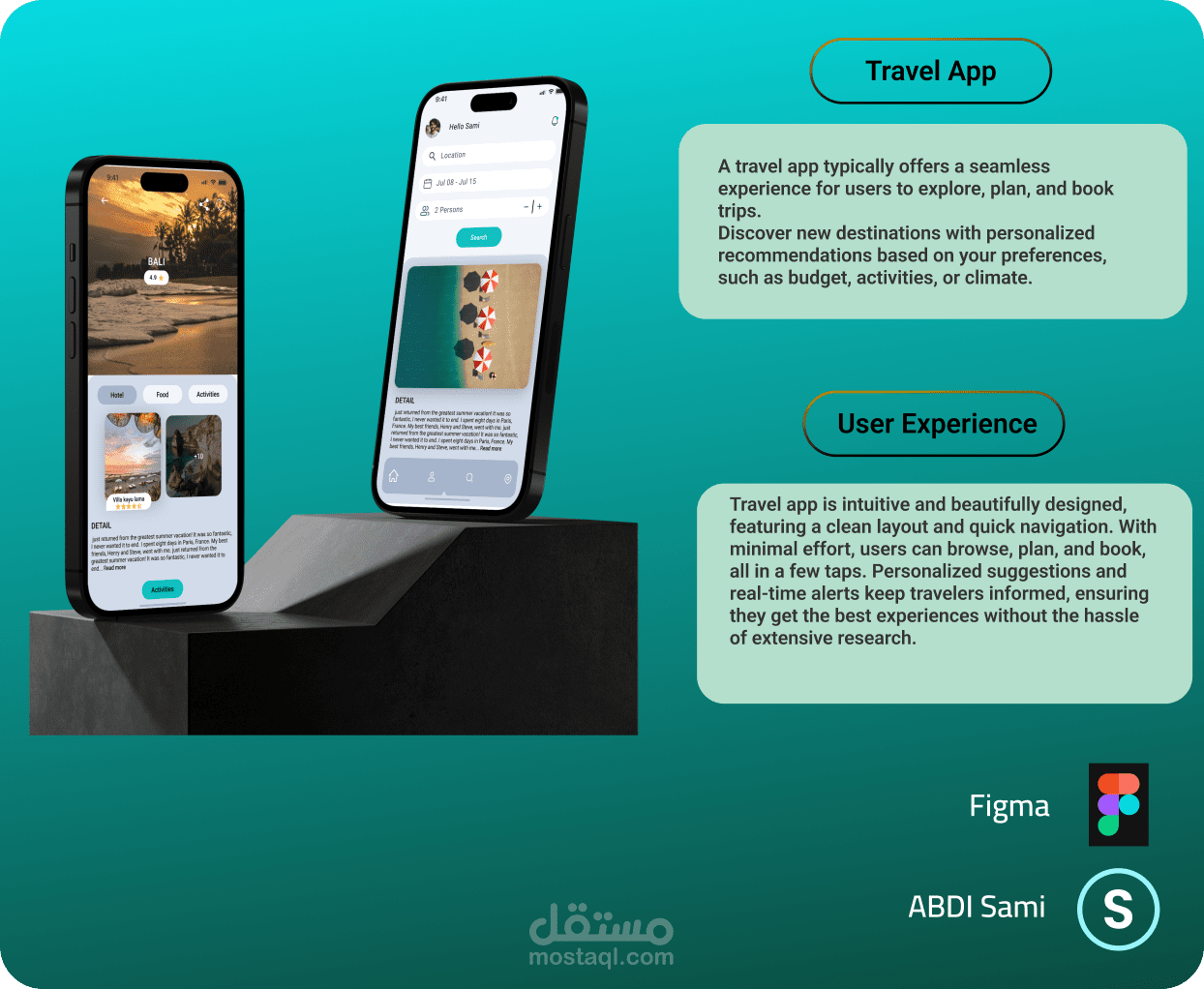العمل عبارة عن واجهة تطبيق جوال لحجز الفنادق خلال السفر والعطل، يقدم تجربة سلسة للمستخدمين لاستكشاف الرحلات والتخطيط لها وحجزها.