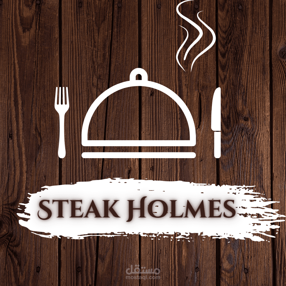 اولا اخترت خلفيه خشب كخلفيه كلاسيكيه للطاولات في المطاعم ,, وتم اضافه ايقونه طبق طعام بلون ابيض مع ايقونه بخار للدلاله على حراره الطعام ,, وايضا تم اضافه ايقونه شوكه وسكينه باللون الابيض لدعم اللوجو واظهاره بشكل مميز .