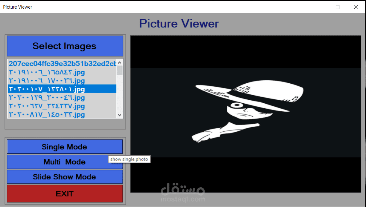 It is a desktop application by it; the user selects a group of pictures using an open dialog control and displays their names in a list box. There are three modes of Operation: single picture, Multi-picture and slide show