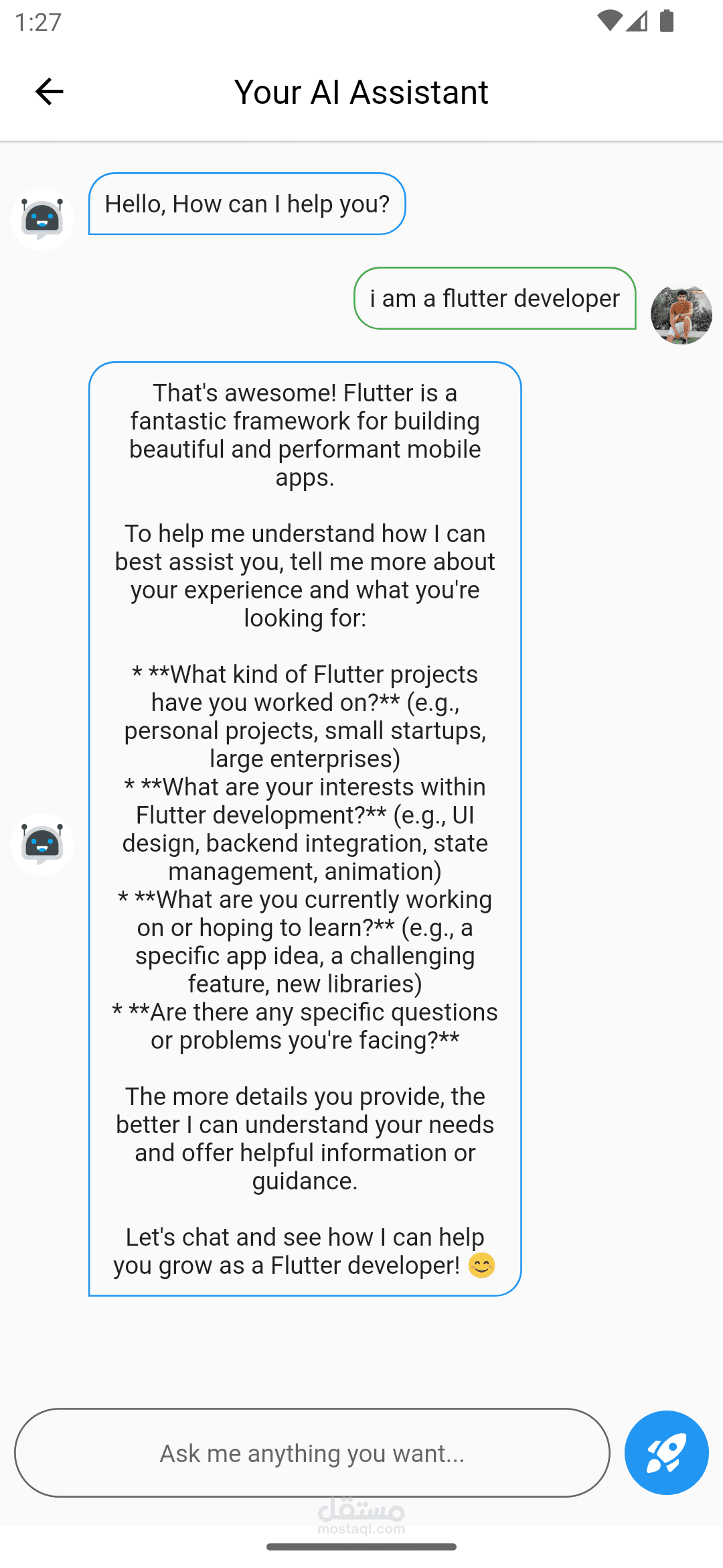 تطبيق المحادثات البسيط يتيح للمستخدمين التحدث مع أصدقائهم بسهولة عبر الرسائل النصية الفورية في واجهة حديثة وسهلة الاستخدام. بالإضافة إلى ذلك، يدمج التطبيق ميزة التفاعل مع الذكاء الصناعي، حيث يمكن للمستخدمين إجراء محادثات مع مساعد ذكي يقدم إجابات واقتراحات بناءً على استفساراتهم. يوفر التطبيق تجربة دردشة تفاعلية تجمع بين التواصل البشري والذكاء الاصطناعي، مما يسهم في تحسين التفاعل اليومي وتقديم الدعم الفوري.