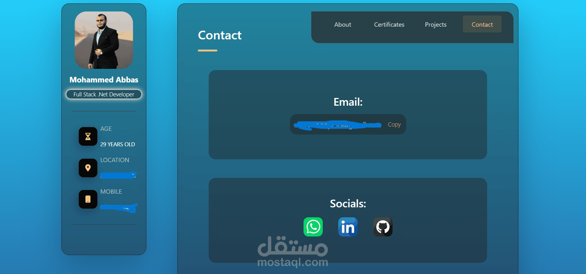 عرض المشاريع: يحتوي البورتفوليو على قسم مخصص لعرض مشاريعي السابقة، مع روابط مباشرة للمستودعات على GitHub ونسخ حية للمشاريع.