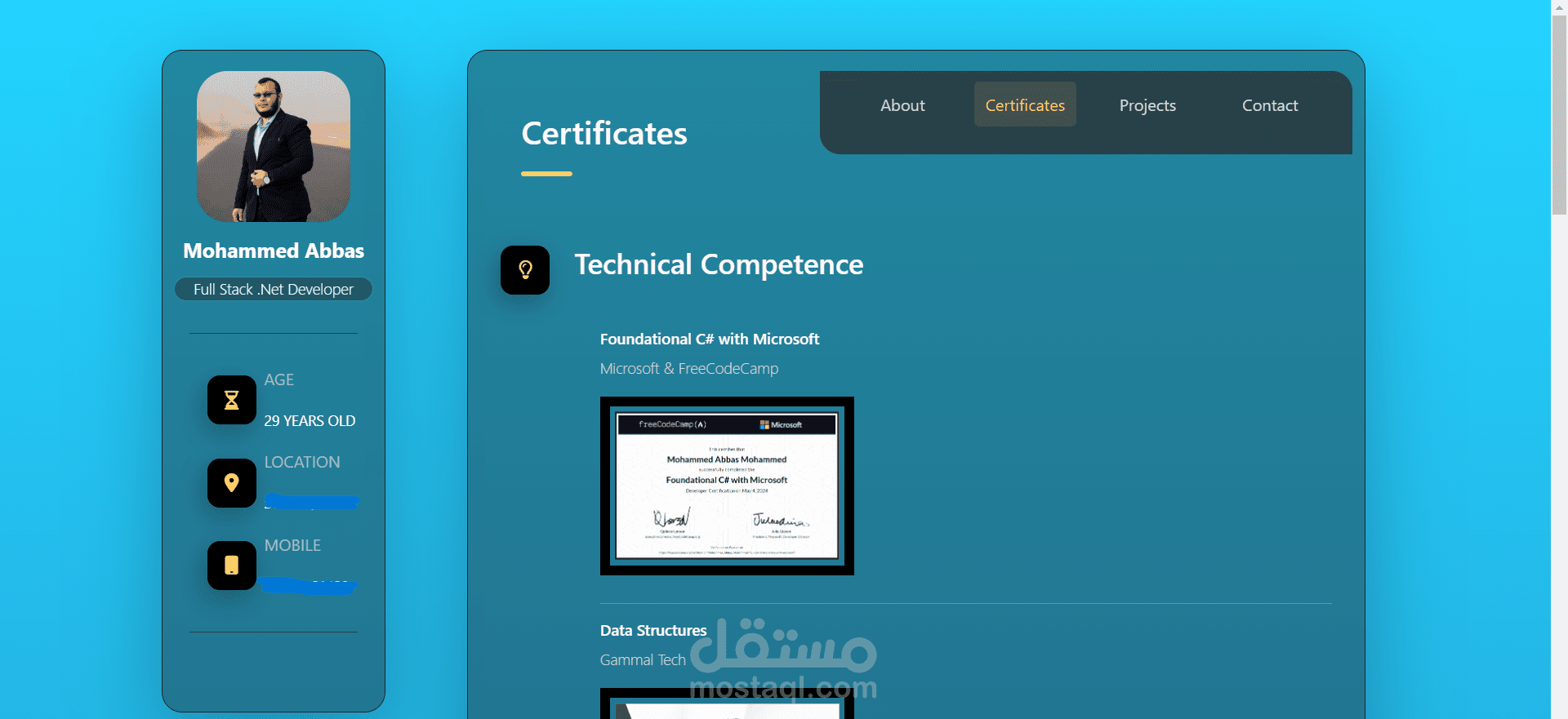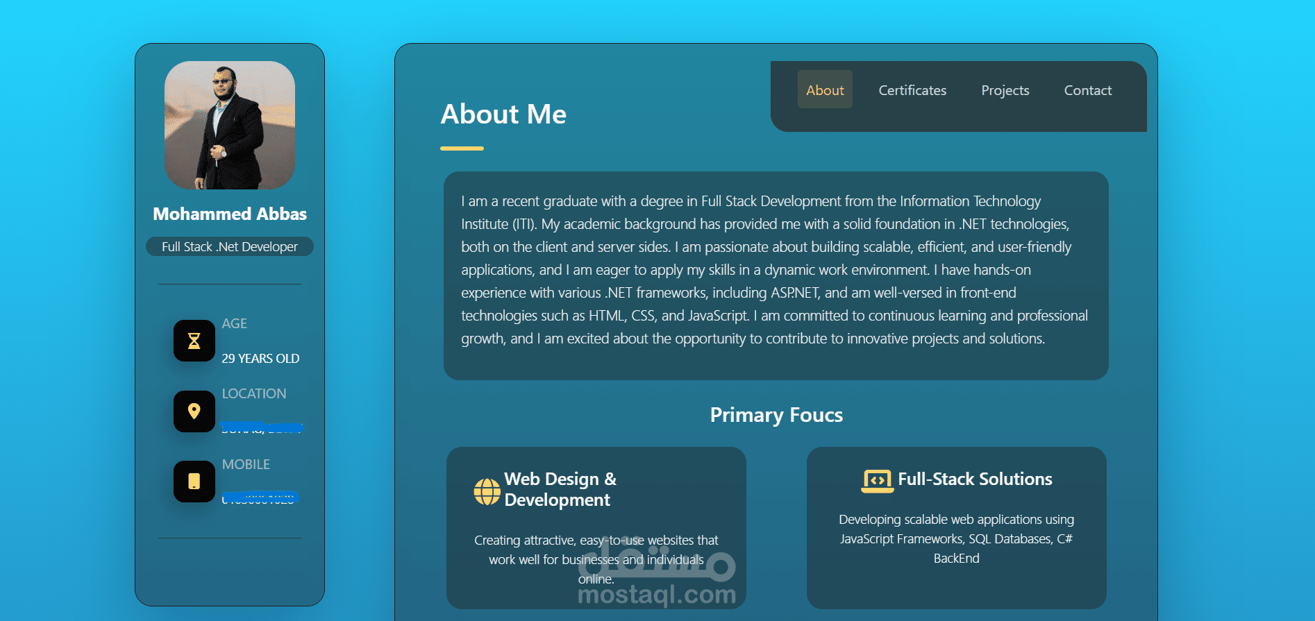 في هذا المشروع، قمت بتطوير صفحة بورتفوليو شخصية باستخدام تقنيات الويب الحديثة مثل HTML، CSS، وJavaScript.