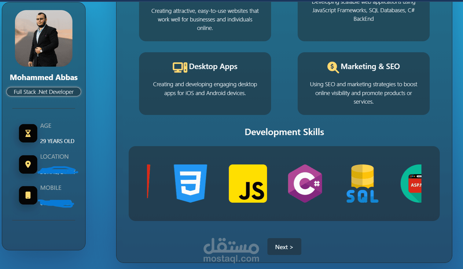 الهدف من المشروع هو إنشاء واجهة احترافية تعكس مهاراتي كمطور برمجيات وتعرض أعمالي السابقة، مشاريعي، وتفاصيل التواصل معي بشكل جذاب وسهل الاستخدام.