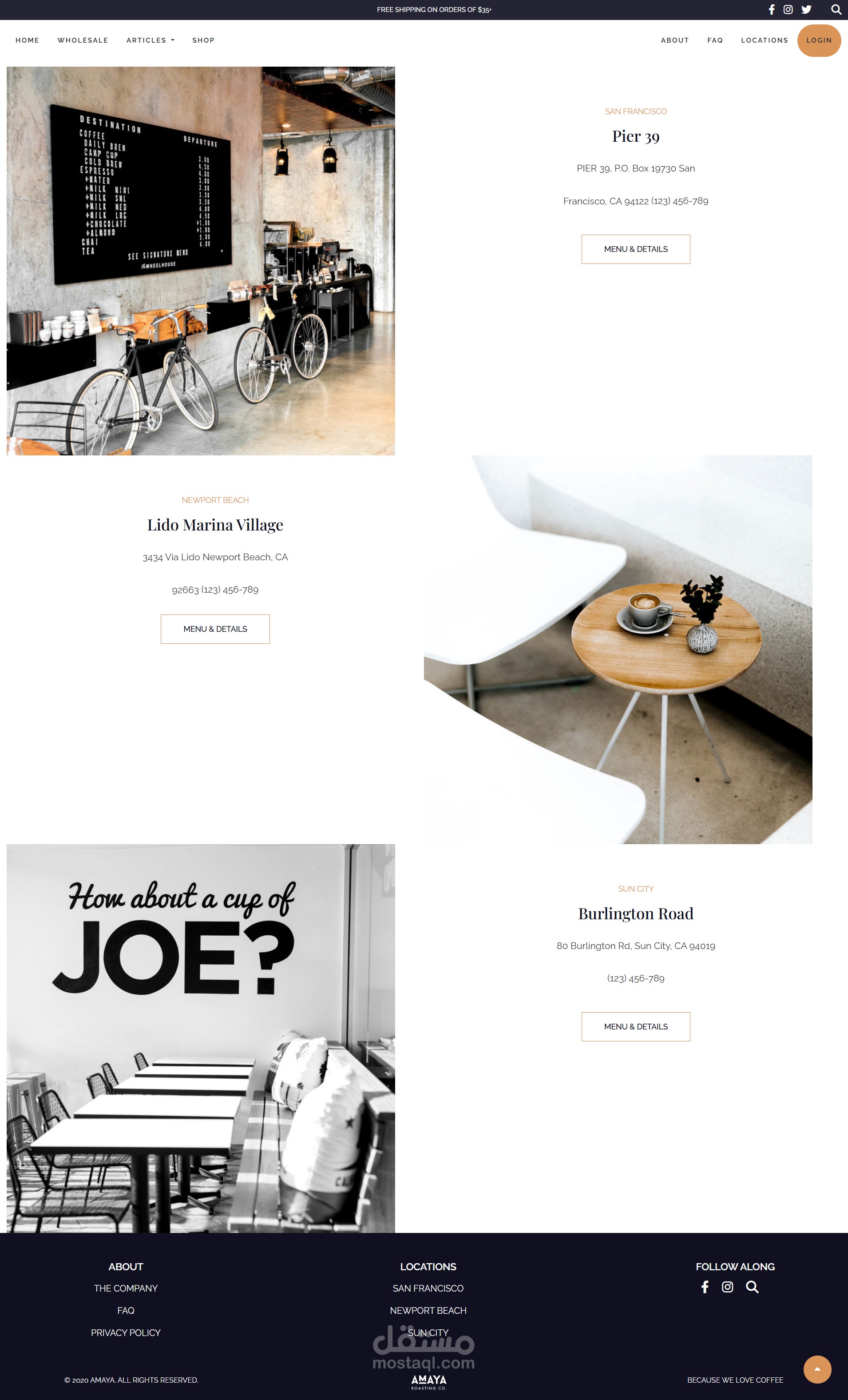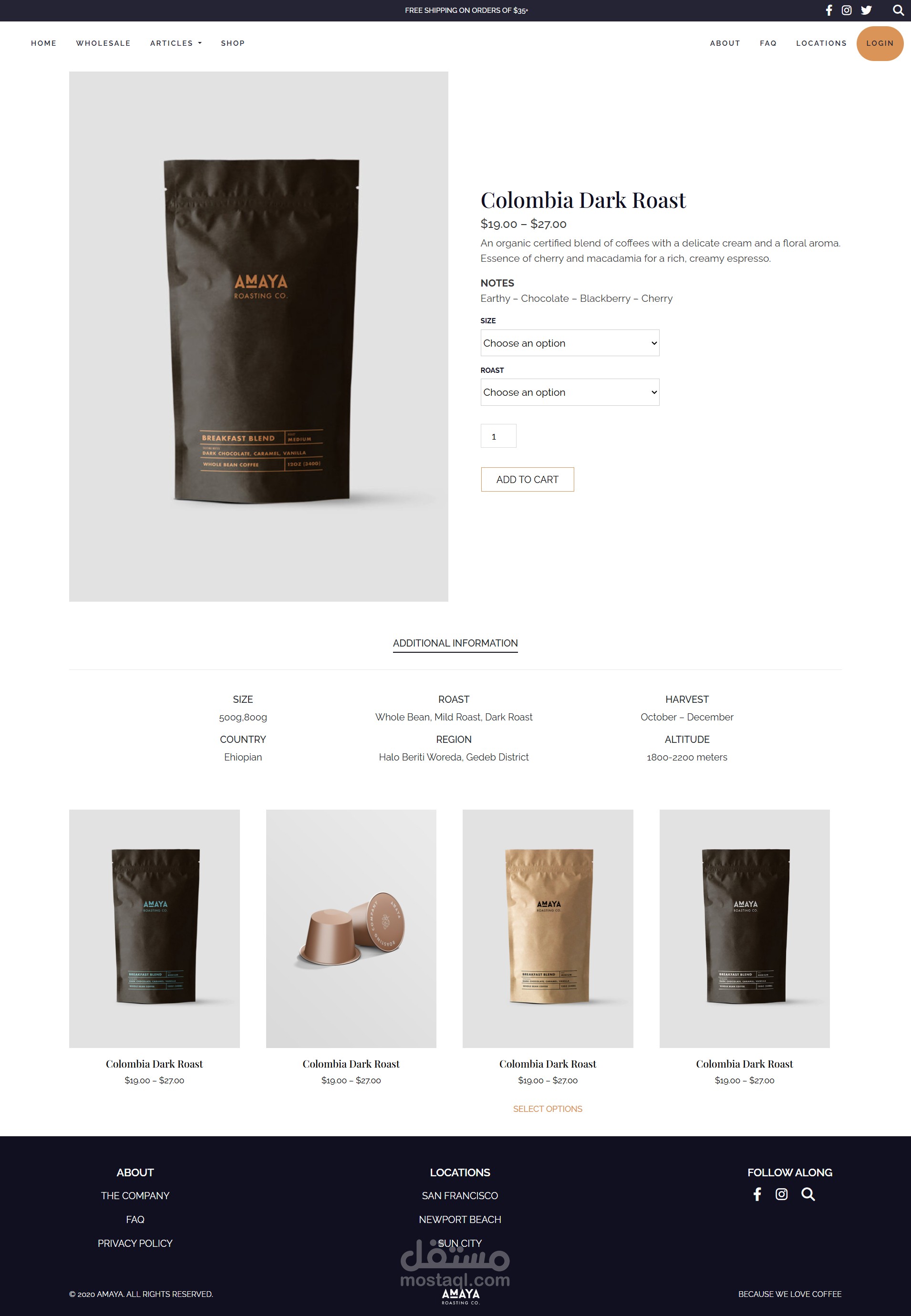 صفحات المنتج: تحتوي على معلومات تفصيلية عن كل نوع قهوة، بما في ذلك الصور، والأسعار، ونوع التحميص، والمكونات.