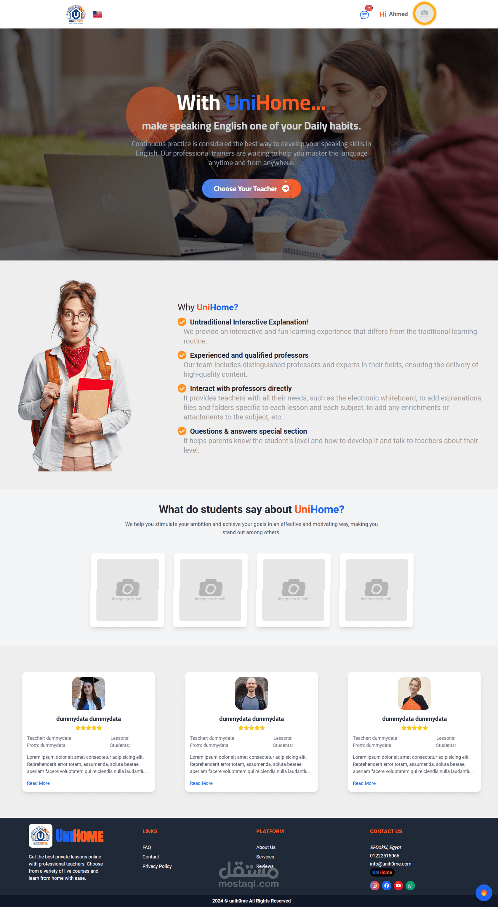 هذا المشروع عبارة عن منصة تعليمية إلكترونية تهدف إلى تقديم محتوى تعليمي شامل ومتنوع للطلاب والمعلمين. توفر المنصة مجموعة من الدورات والمحتويات التعليمية في مجالات متعددة، مما يسهل عملية التعلم عن بُعد ويعزز من تجربة التعليم.
