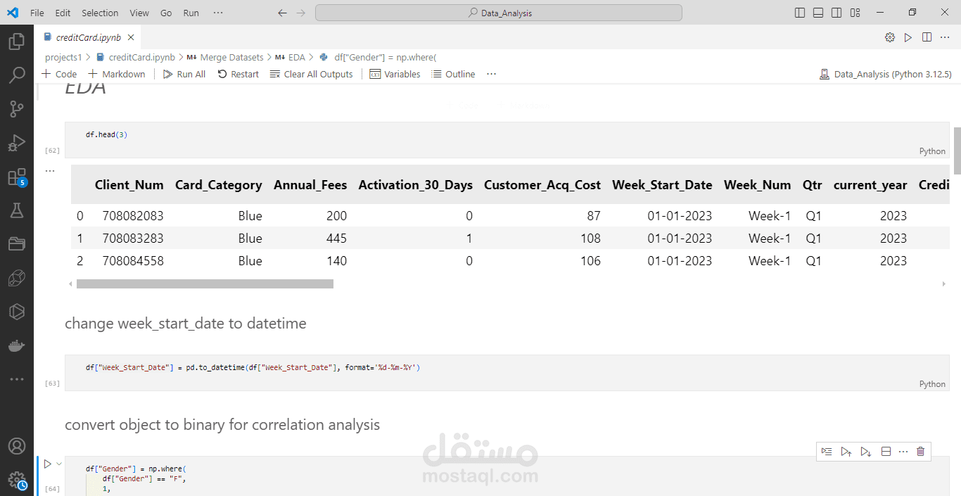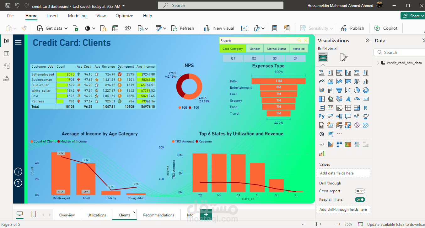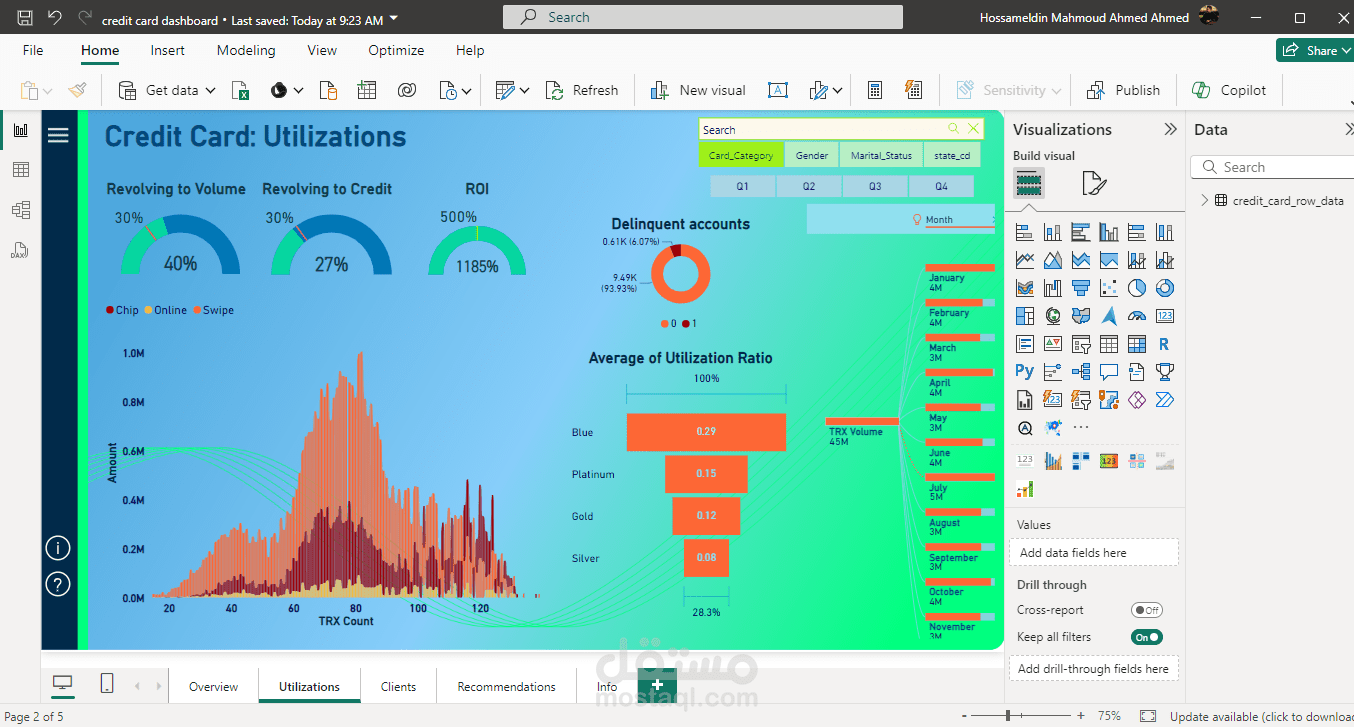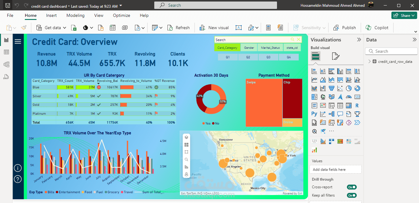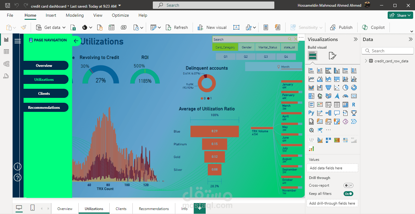 نظرة عامة: يهدف هذا المشروع إلى تحليل المقاييس الرئيسية المتعلقة باستخدام وأداء بطاقات الائتمان، باستخدام لوحات معلومات شاملة لتقديم رؤى حول سلوك العملاء، حجم المعاملات، الإيرادات، والبيانات الديموغرافية.