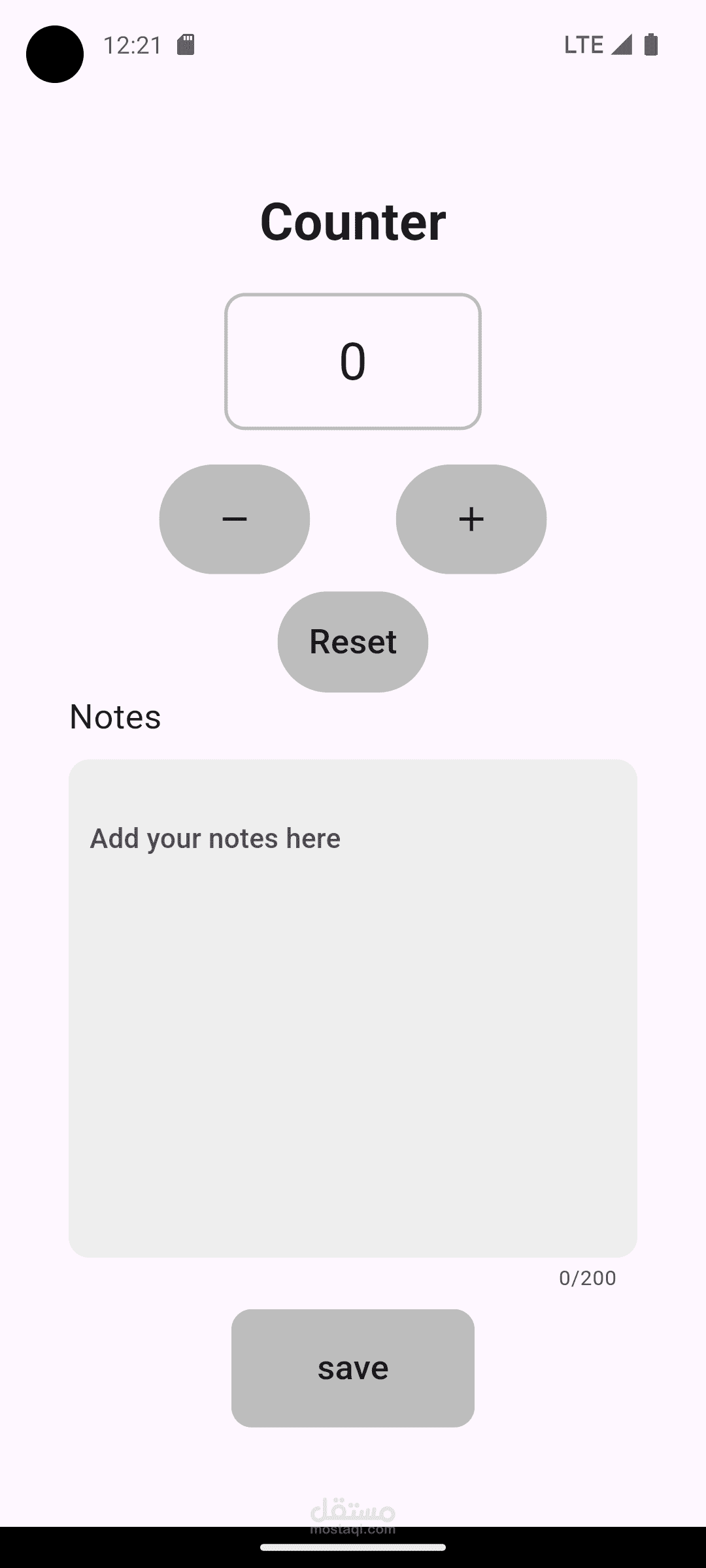 بالإضافة إلى وظيفة العداد، يتضمن التطبيق قسمًا لتدوين الملاحظات حيث يمكن للمستخدم إضافة ملاحظاته الخاصة داخل مربع نص مع إمكانية كتابة ما يصل إلى 200 حرف. بعد كتابة الملاحظات، يمكن للمستخدم حفظها باستخدام زر "Save" الموجود أسفل مربع النص.