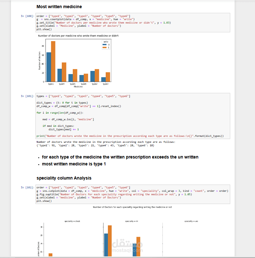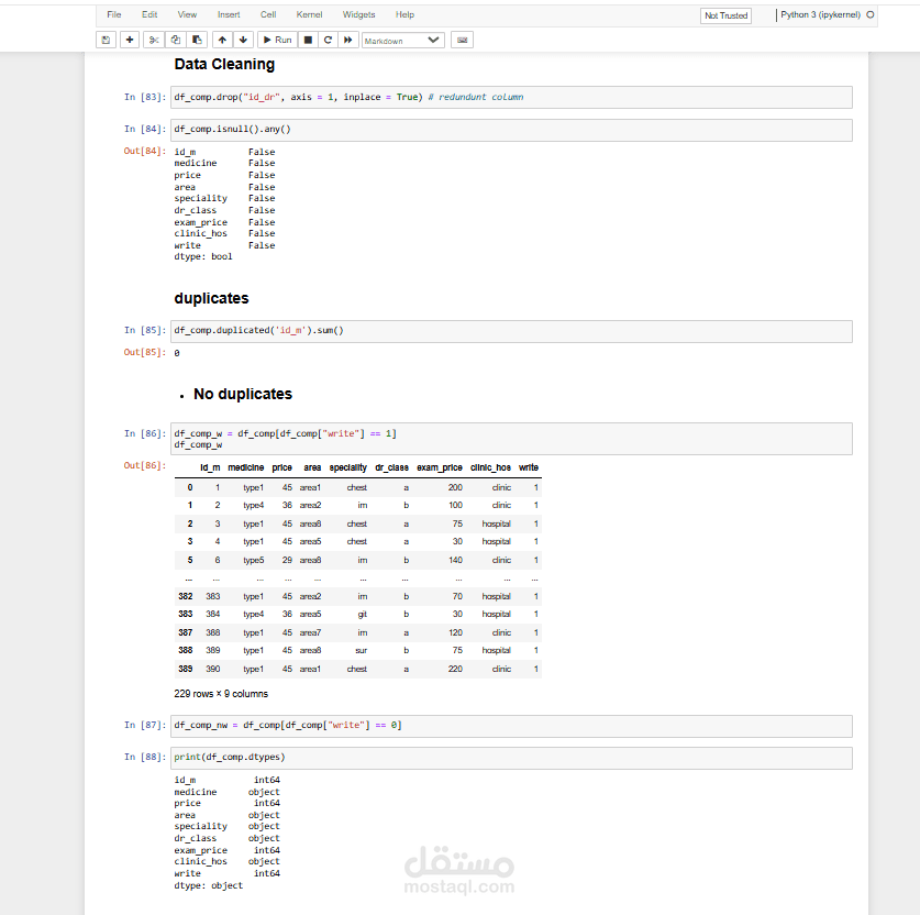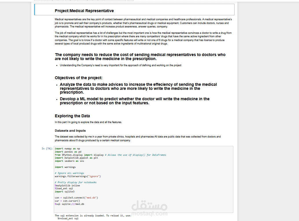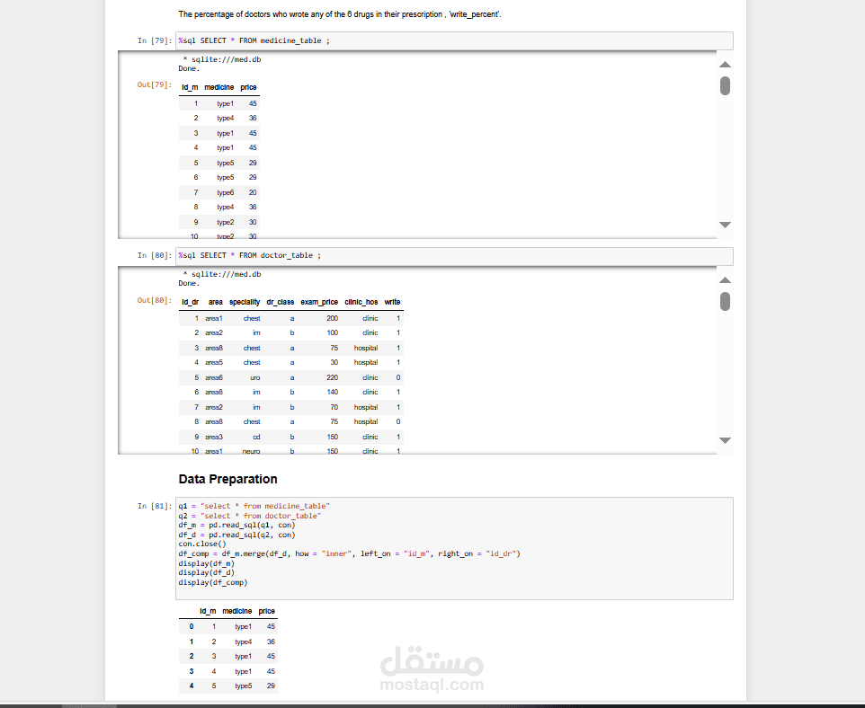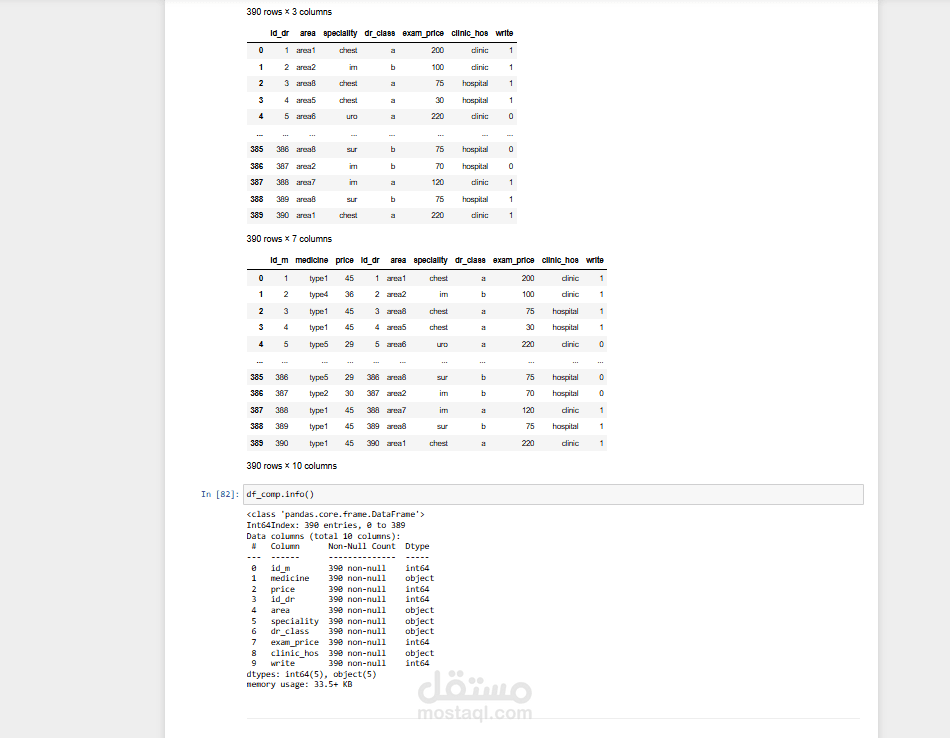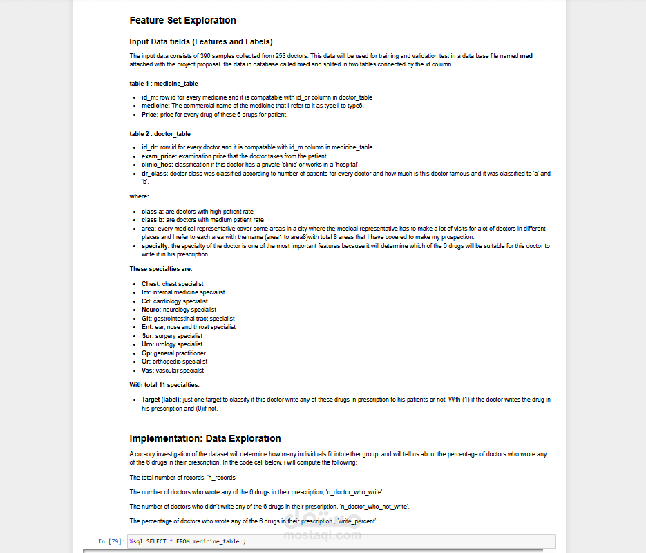 استخراج البيانات من قاعدة البيانات ثم عمل استكشاف للبيانات ثم دمج 2 جدول ثم تنظيف البيانات باستخدام pandas ثم عمل تصوير للبيانات باستخدام matplotlib و seaborn ثم تجهيز البيانات لعمل نموذج للتنبؤ بالحالة والوصول الى دقة تتجاوز 82%.