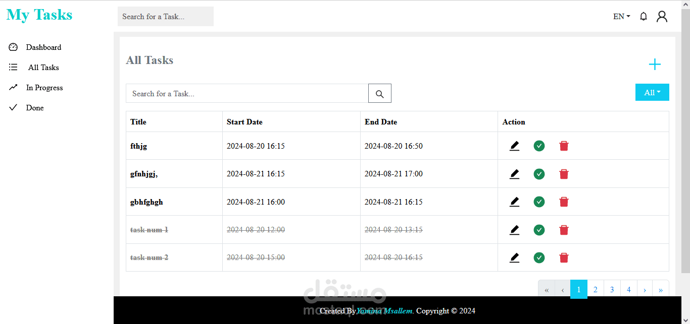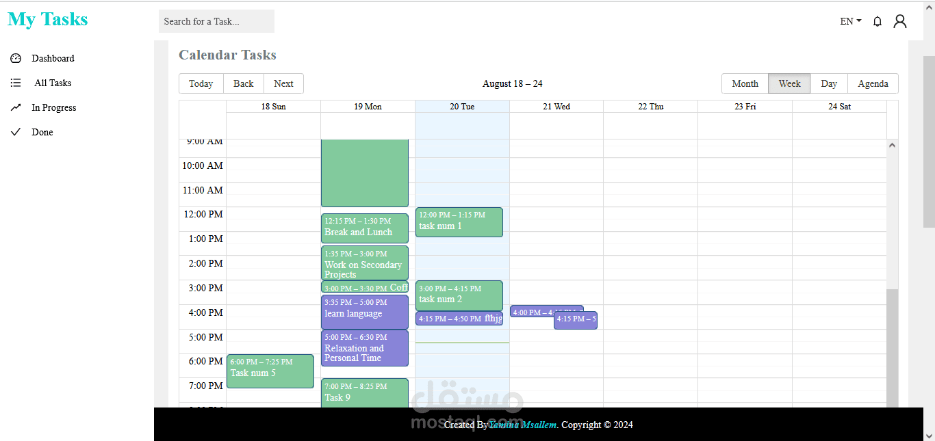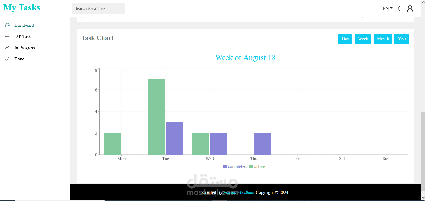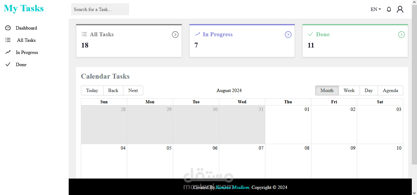 My Tasks هو تطبيق تم إنشاؤه باستخدام React.js. يوفر هذا التطبيق واجهة تفاعلية وسهلة الاستخدام لإدارة المهام، ويضم وظائف متقدمة مثل البحث عن المهام وعرض التقويم والتصورات الرسومية.