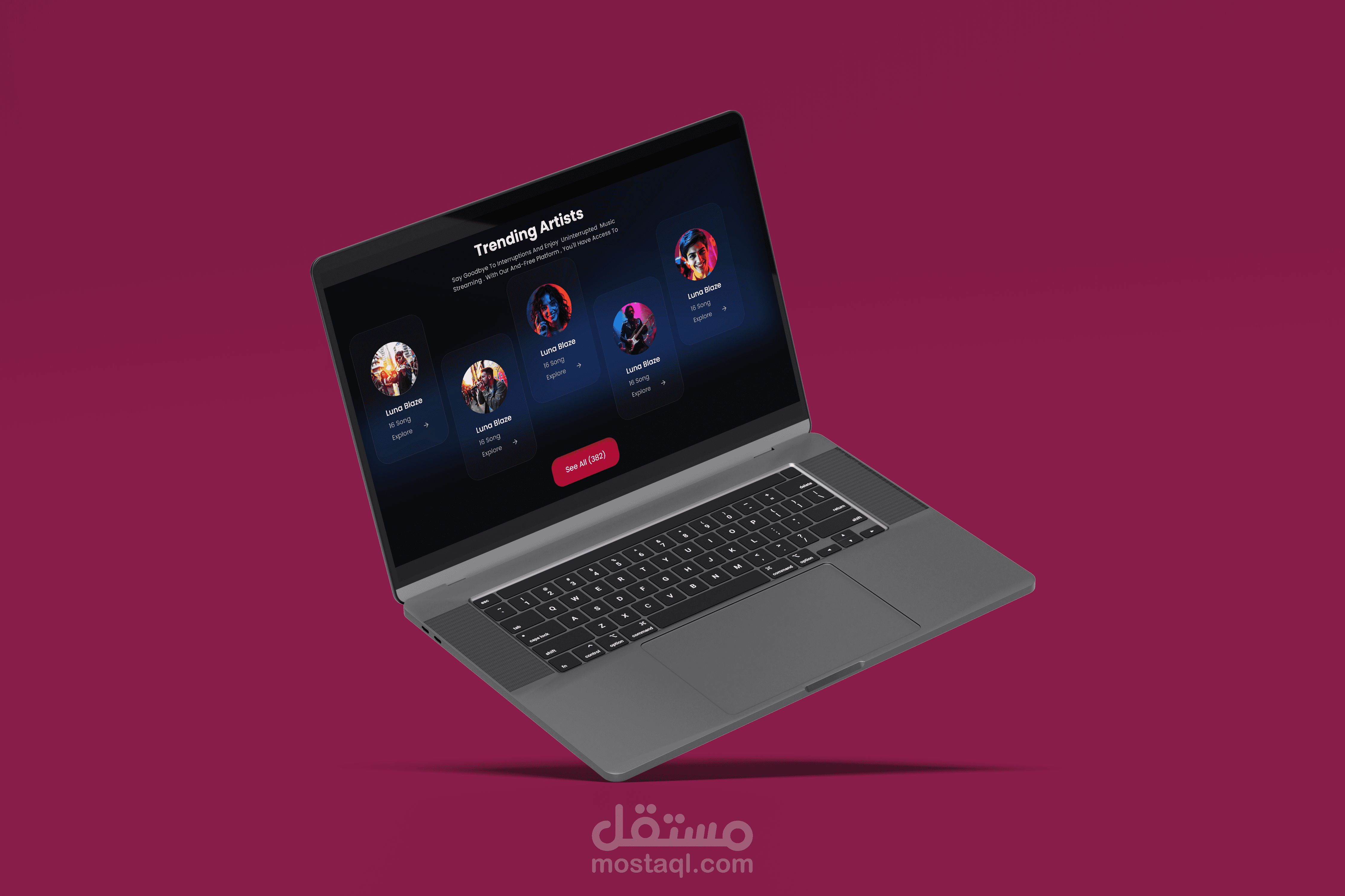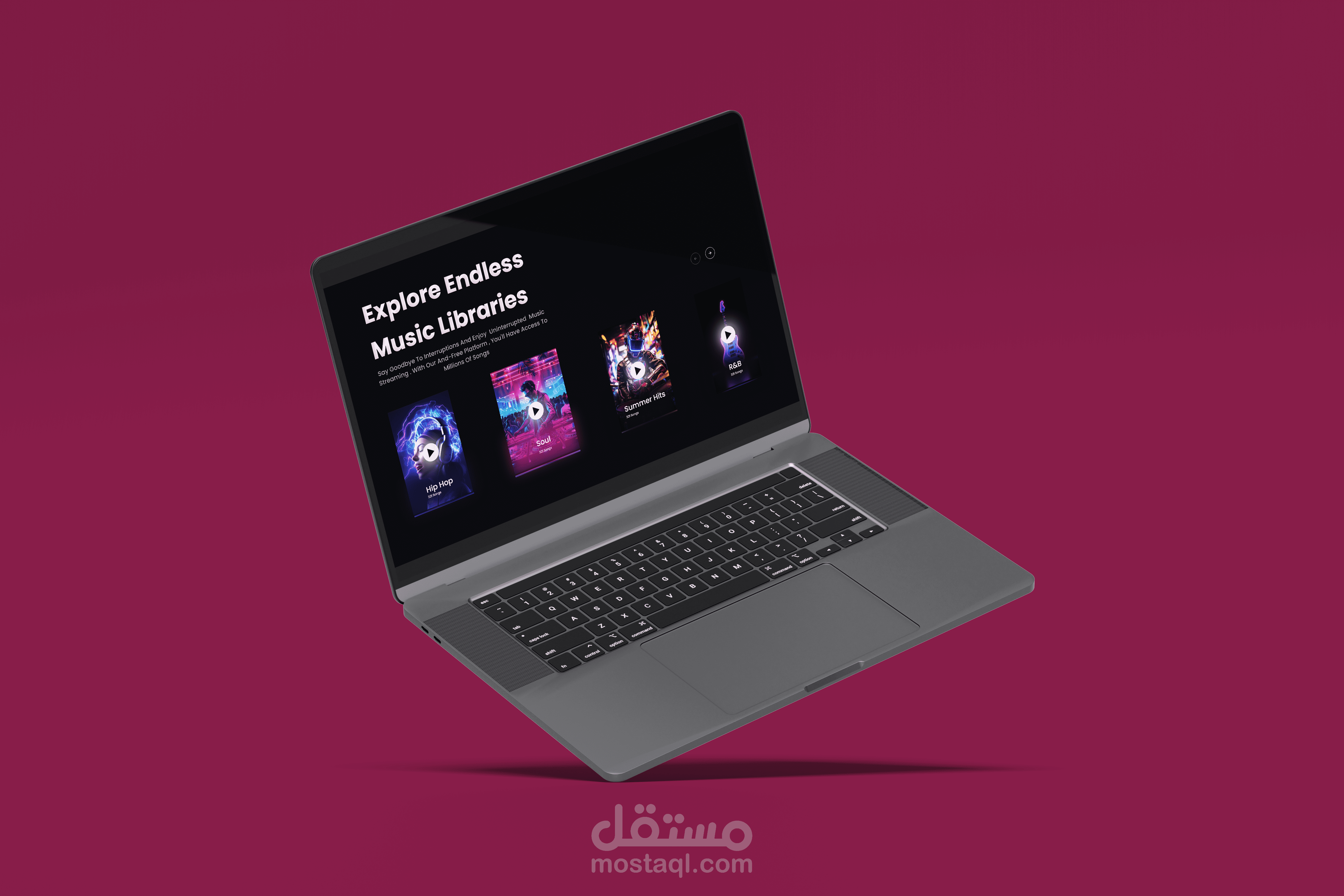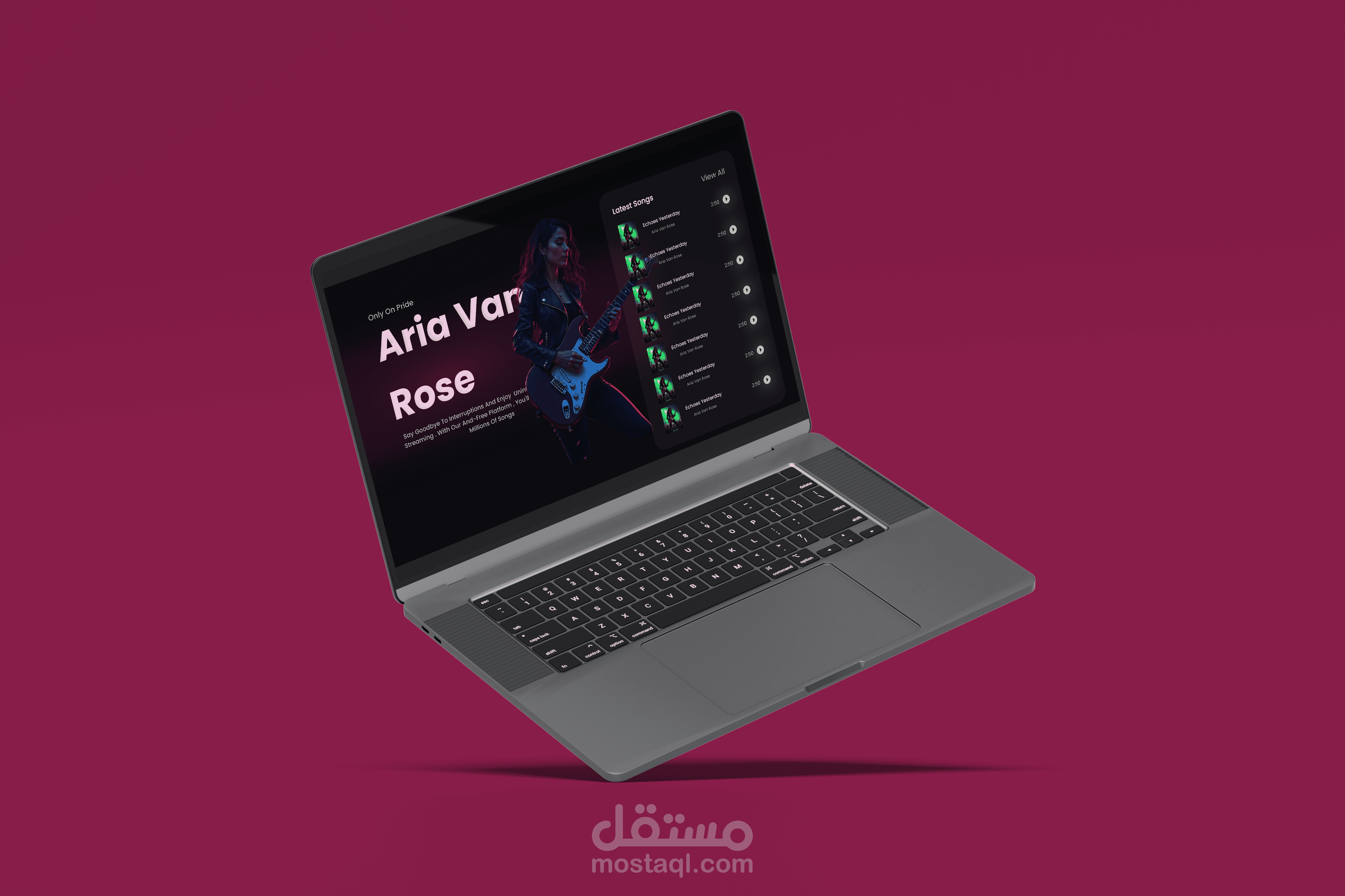 التنقل (Navigation bar): قوائم الألبومات، الأغاني الأكثر شعبية، الجديد، قوائم التشغيل المفضلة.