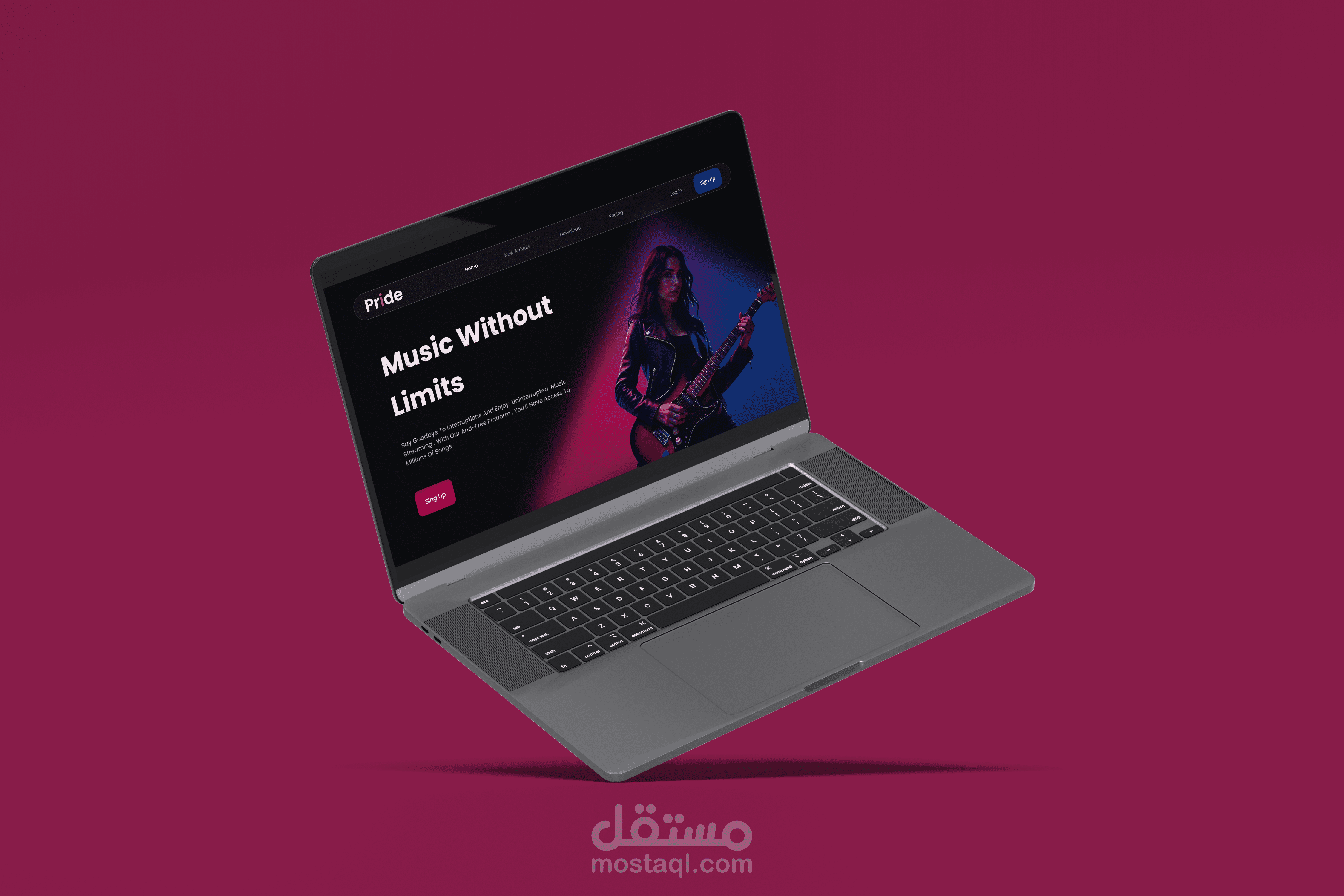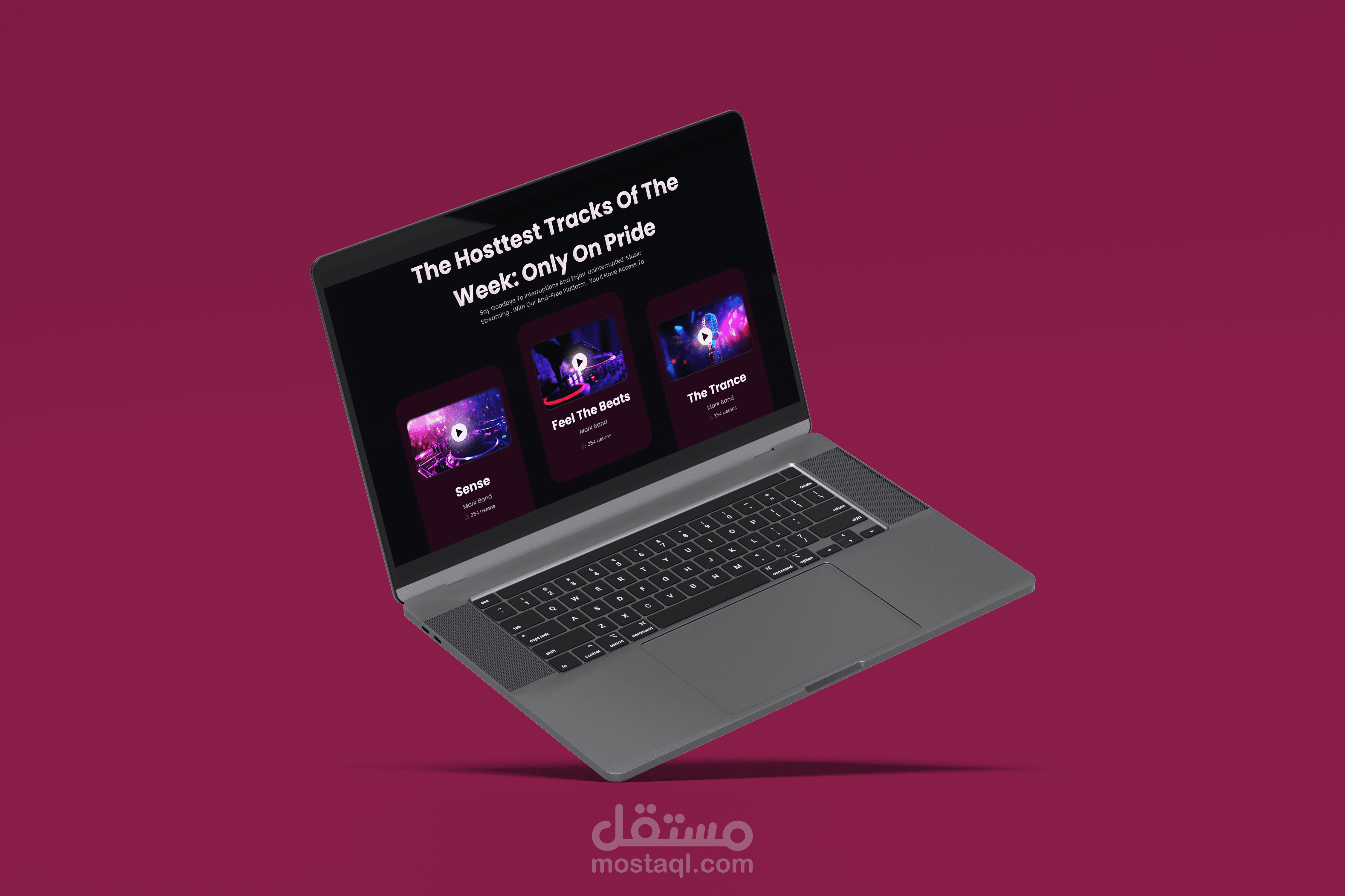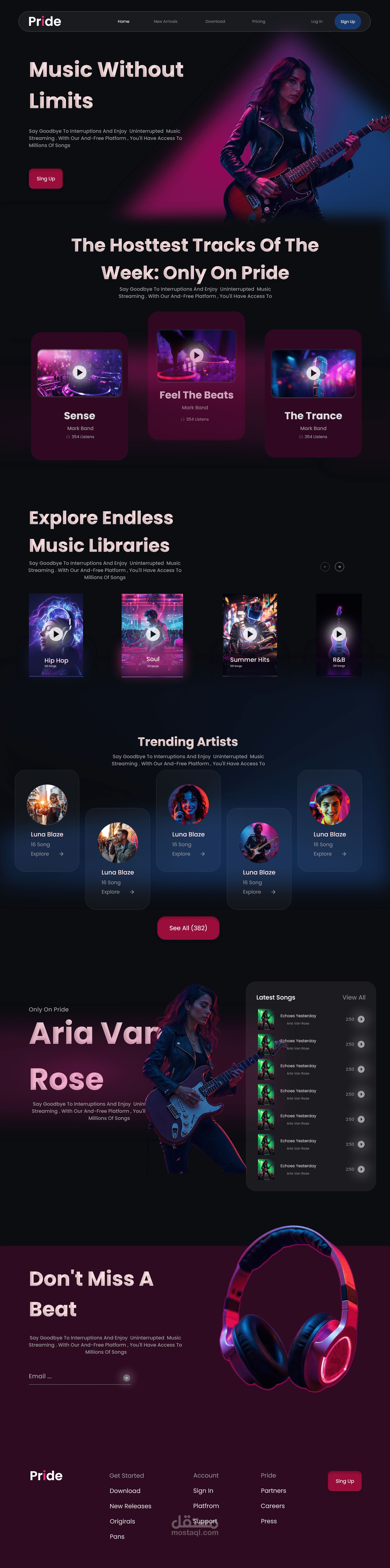 التنقل (Navigation bar): قوائم الألبومات، الأغاني الأكثر شعبية، الجديد، قوائم التشغيل المفضلة.