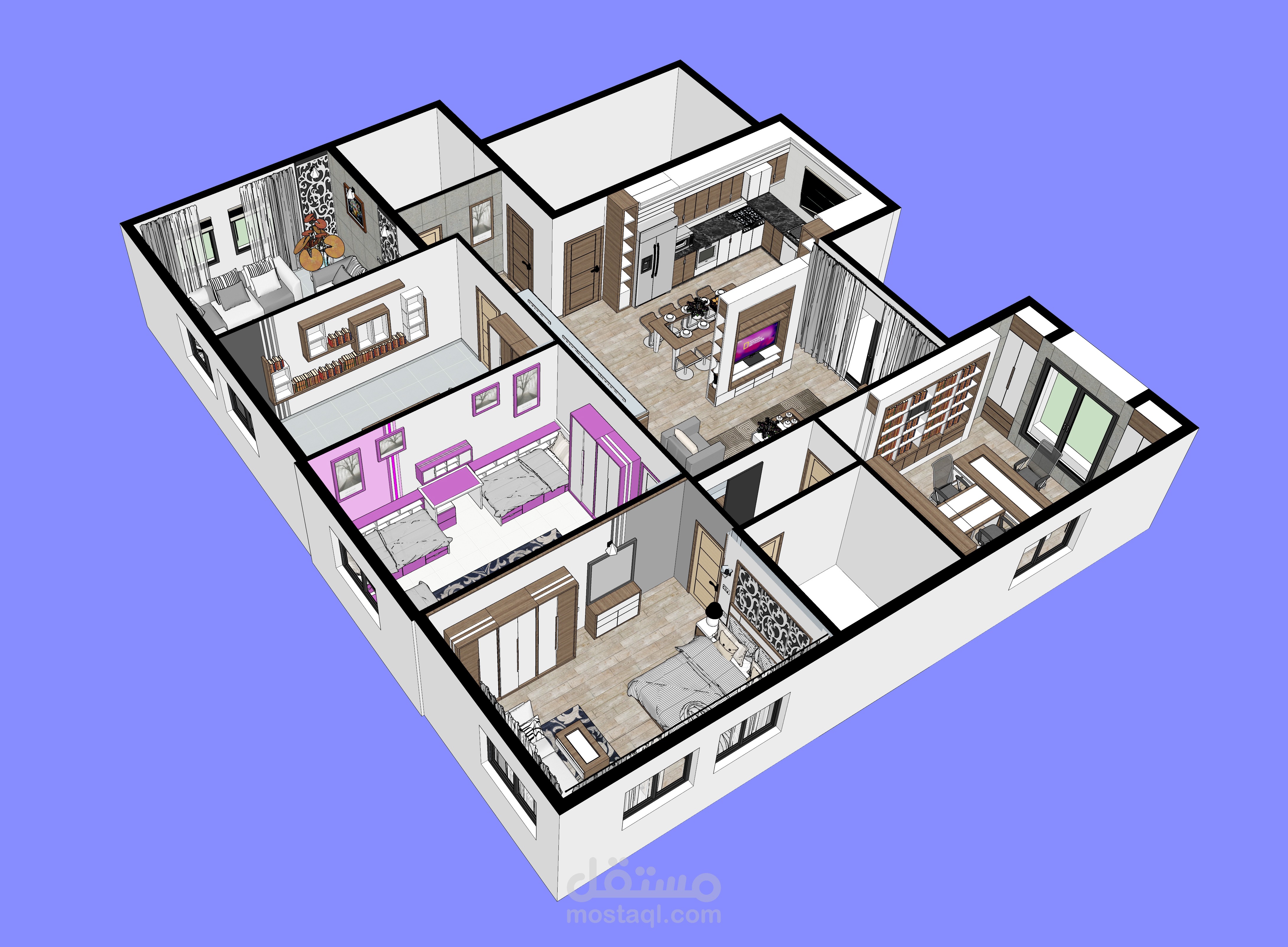 تصميم داخلي لشقة سكنية لكافة الفراغات المكونة للشقة
