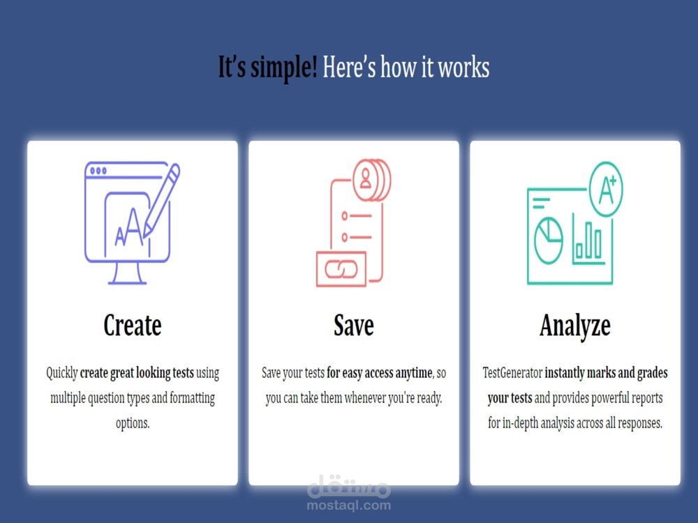 يتيح TestGenerator للمستخدمين إنشاء اختبارات مخصصة عن طريق تحديد عدد الأسئلة، الحقول، ومستوى الصعوبة. بفضل واجهته السهلة الاستخدام وتصميمه المتجاوب، يضمن التطبيق تجربة سلسة على أي جهاز. يمكن للمستخدمين تهيئة الأسئلة الجاهزة أو كتابة أسئلتهم الخاصة، مما يمنحهم تحكمًا كاملًا في محتوى الاختبار. بالإضافة إلى ذلك، يمكن للمستخدمين إنشاء حساباتهم الخاصة، حيث يتم حفظ الاختبارات التي يقومون بإنشائها تلقائيًا أو يدويًا، مما يتيح لهم العودة إليها في أي وقت يريدون. يعد TestGenerator مثاليًا للاستخدام في التعليم، التدريب، أو غيرها من الاحتياجات، حيث يقدم منصة أنيقة وسهلة الاستخدام لإنشاء وإدارة الاختبارات.