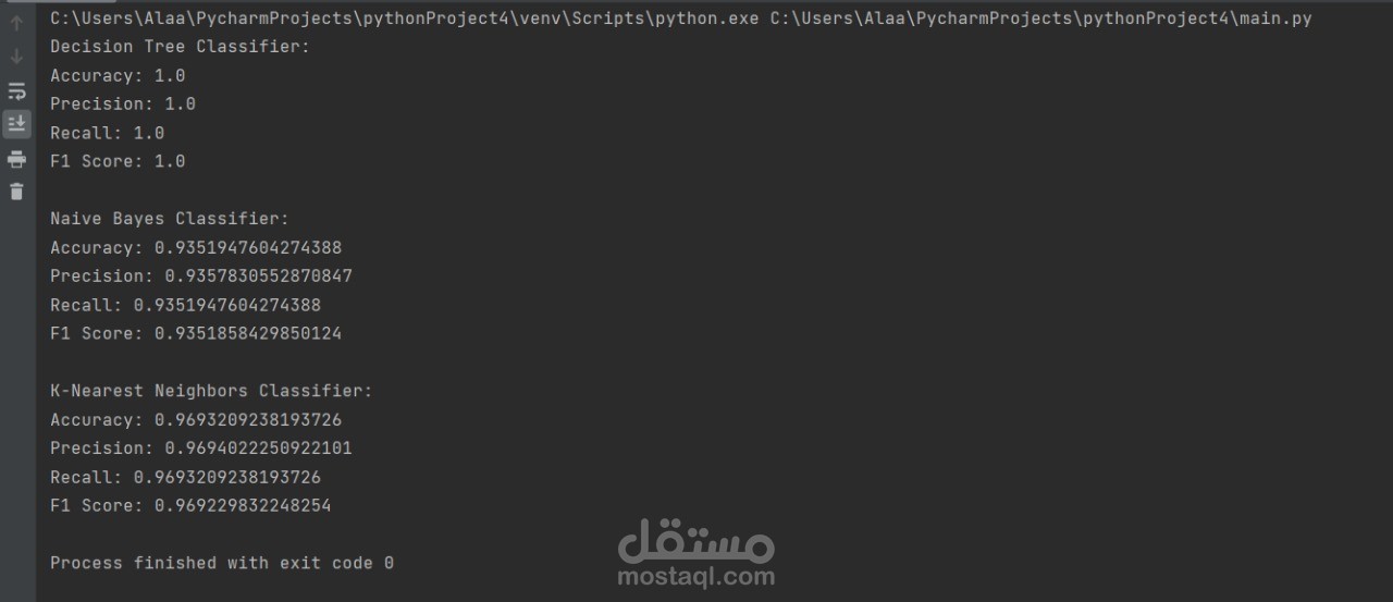 - **Decision Tree Classifier**: Splits the data into training and test sets, trains a decision tree model, and evaluates it using accuracy, precision, recall, and F1 score. The results are saved to a file.