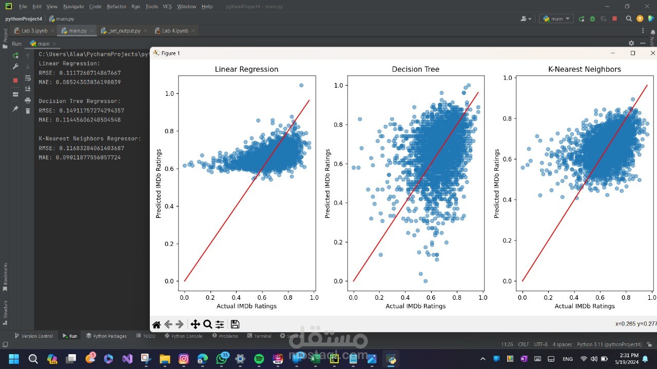 - **Linear Regression**: Trains a linear regression model to predict IMDb ratings based on features like `runtimeMinutes` and `year`. The performance is evaluated using RMSE (Root Mean Squared Error) and MAE (Mean Absolute Error), and the predictions are visualized with a scatter plot of actual vs. predicted values.