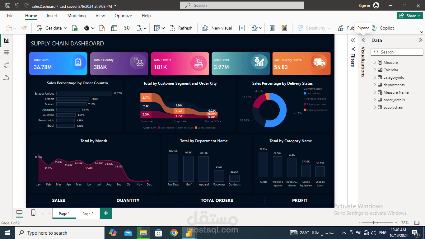 This dashboard provides essential insights into sales, customer segments, delivery performance, and category trends, aiding in strategic decision-making for supply chain management. The use of various chart types helps visualize complex data for efficient tracking and analysis.