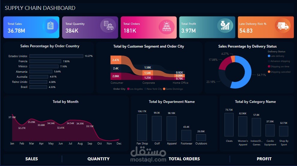 This is a Power BI Supply Chain Dashboard that provides a high-level overview of key performance metrics related to sales, orders, and delivery efficiency. The dashboard features a clean and structured layout with several visual elements, including:
