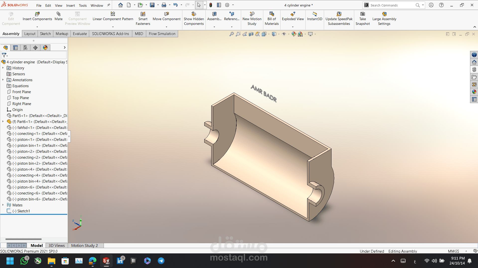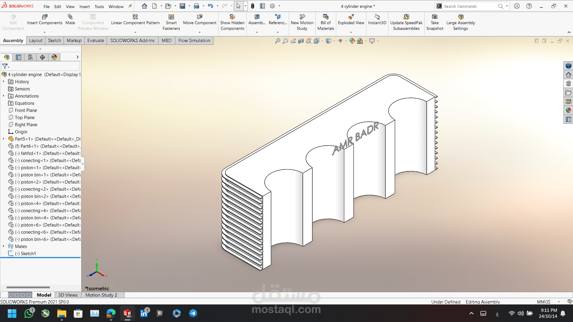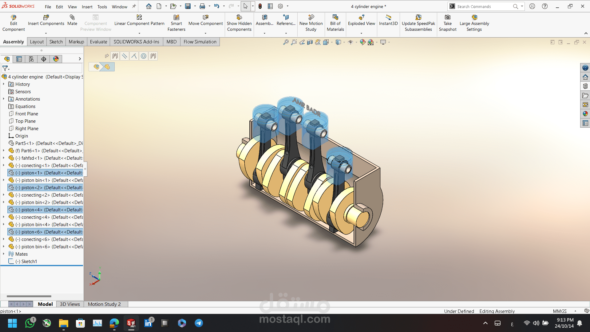 تم تصميم محرك 4 سلندر باستخدام SolidWorks، حيث يحتوي على أربع أسطوانات مرتبة بشكل متوازي داخل كتلة المحرك (Engine Block). يتميز التصميم بتوزيع متساوٍ للقوة الناتجة عن الاحتراق، مما يوفر أداءً سلسًا وثابتًا.