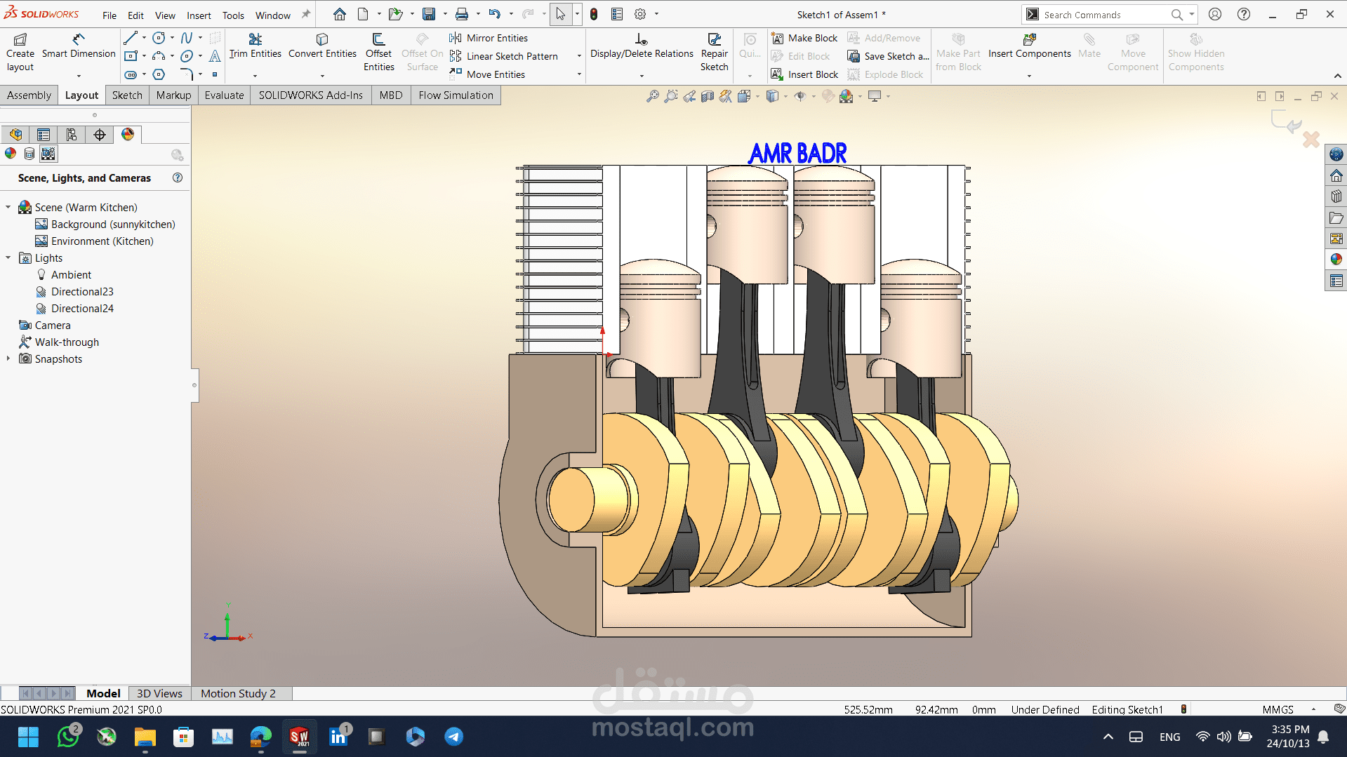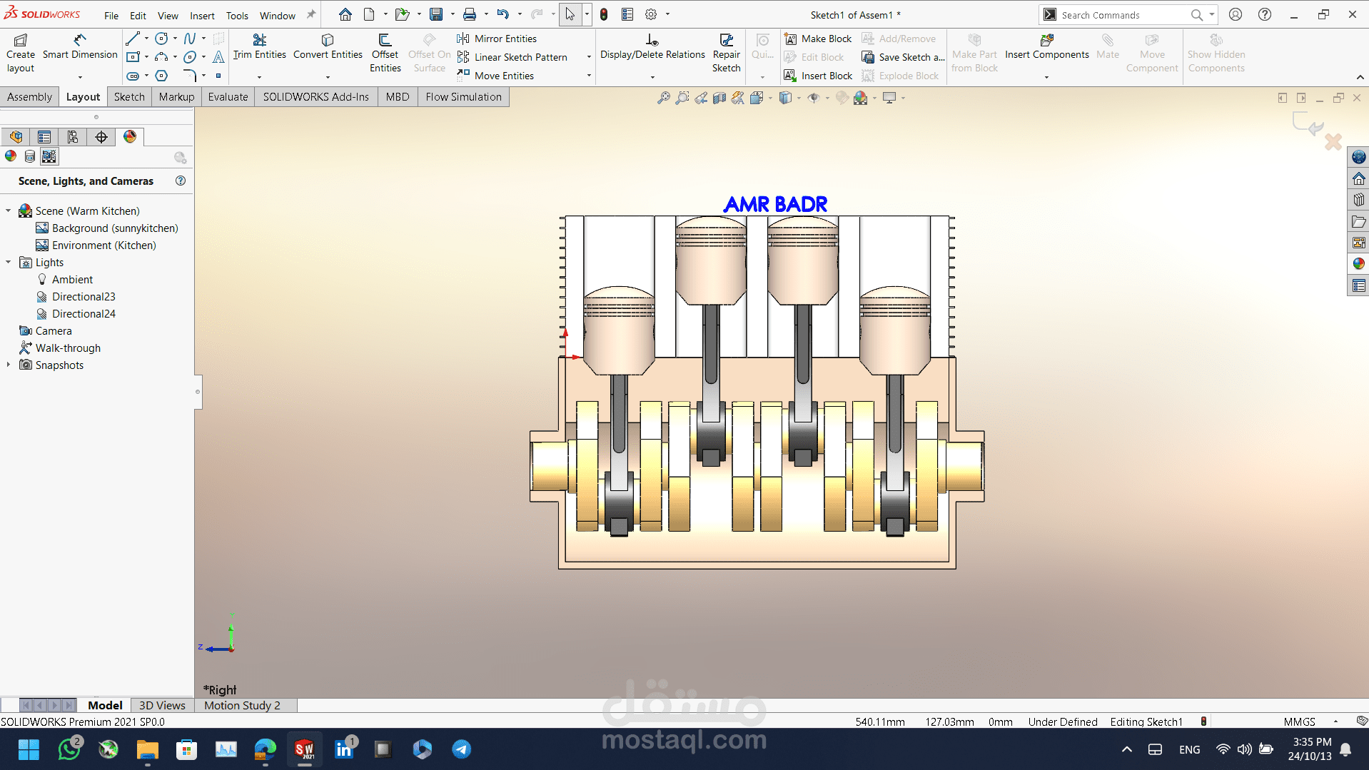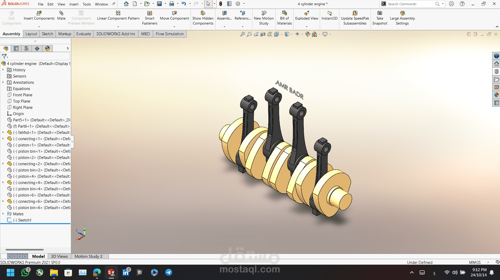 تم تصميم محرك 4 سلندر باستخدام SolidWorks، حيث يحتوي على أربع أسطوانات مرتبة بشكل متوازي داخل كتلة المحرك (Engine Block). يتميز التصميم بتوزيع متساوٍ للقوة الناتجة عن الاحتراق، مما يوفر أداءً سلسًا وثابتًا.
