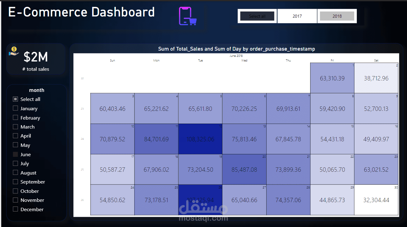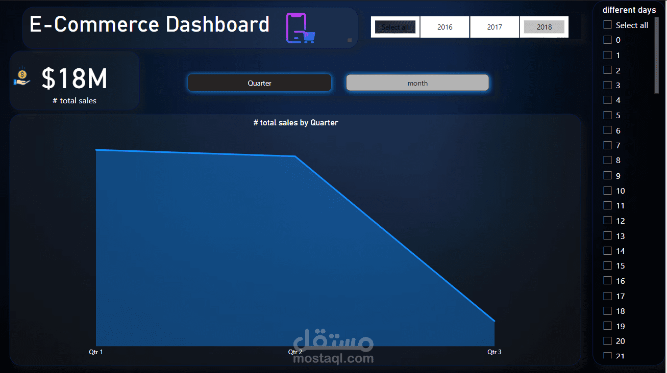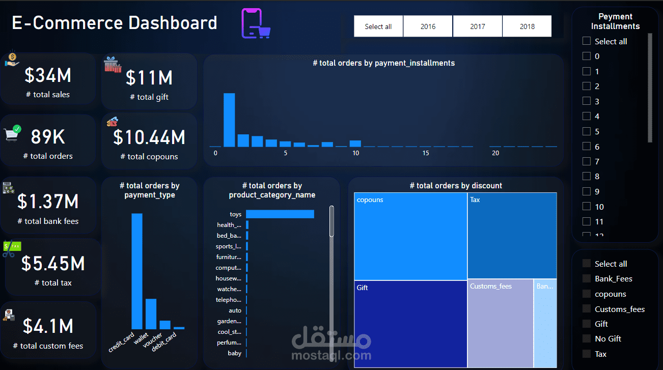 في هذا المشروع، قمت بتطوير لوحة تحكم متقدمة للتجارة الإلكترونية باستخدام Power BI، تهدف إلى تحليل شامل لأداء المتجر الإلكتروني وتقديم رؤى دقيقة تساعد على اتخاذ قرارات مبنية على البيانات.