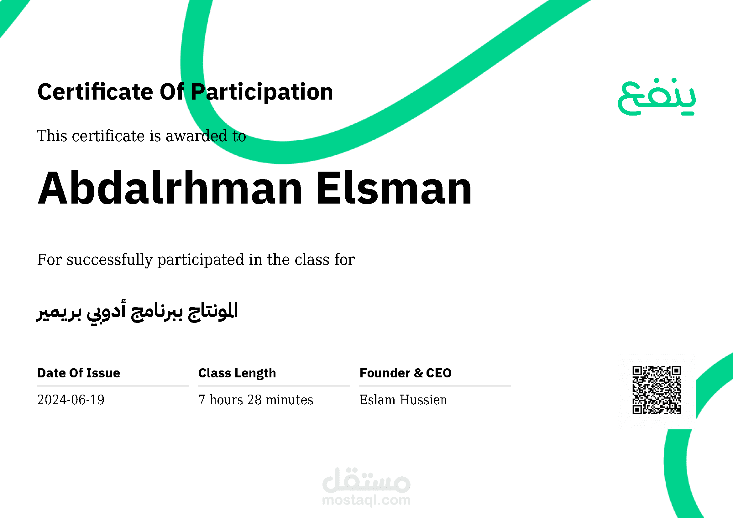شهادة متقدمة أتقنت من خلالها العمل الاحترافي على برنامج Adobe Premiere، شاملة تقنيات المونتاج، تصحيح الألوان، المؤثرات الانتقالية، وتنظيم المشاريع بكفاءة.