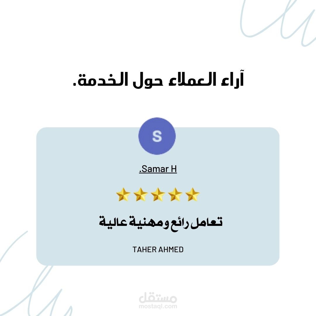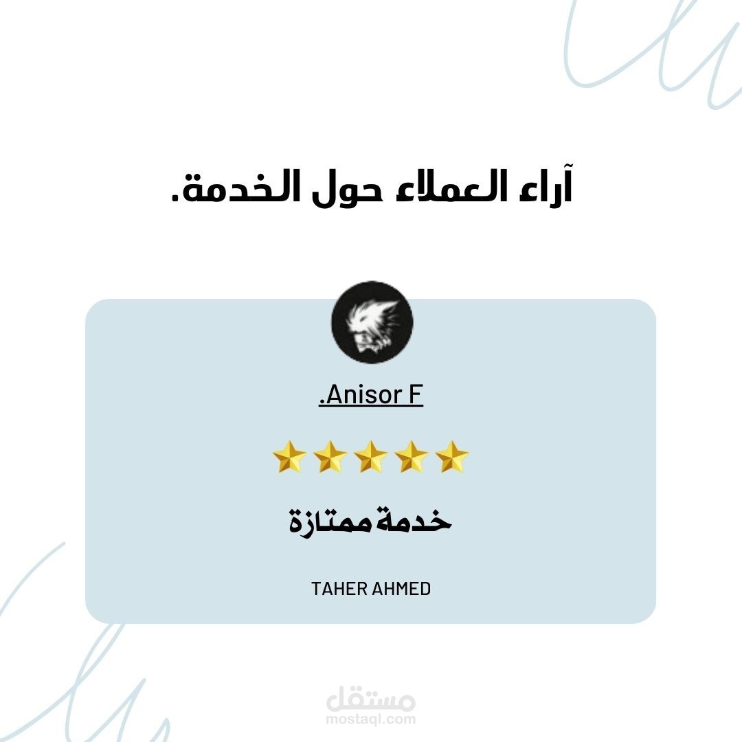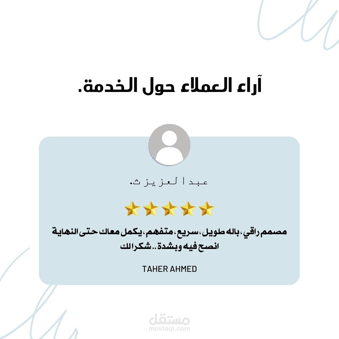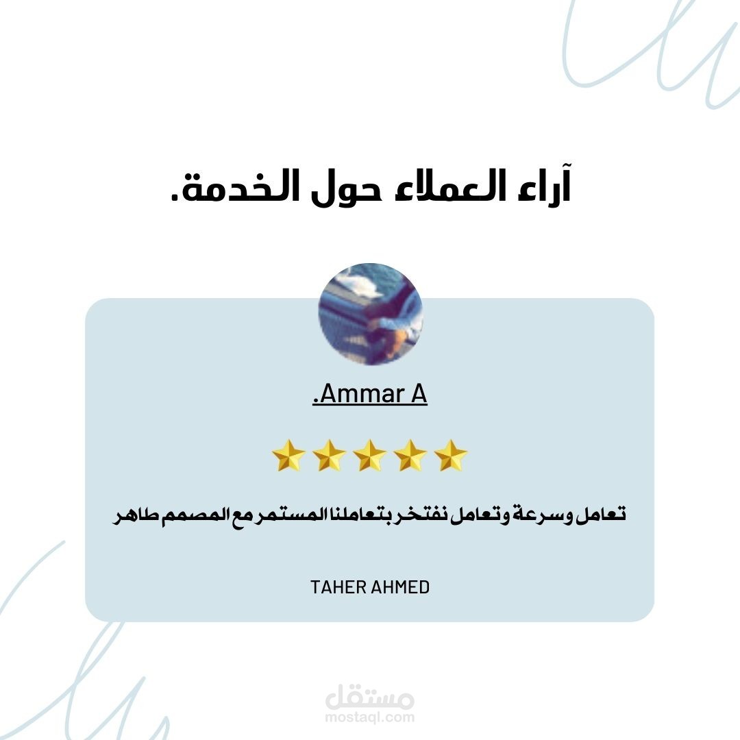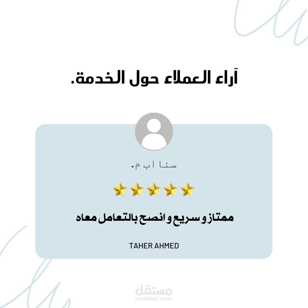 قمت بتصميم العديد من آراء العملاء على منصات متعددة لعرض جودة الخدمة التي أقدمها وزيادة ثقة العملاء الجدد. ️