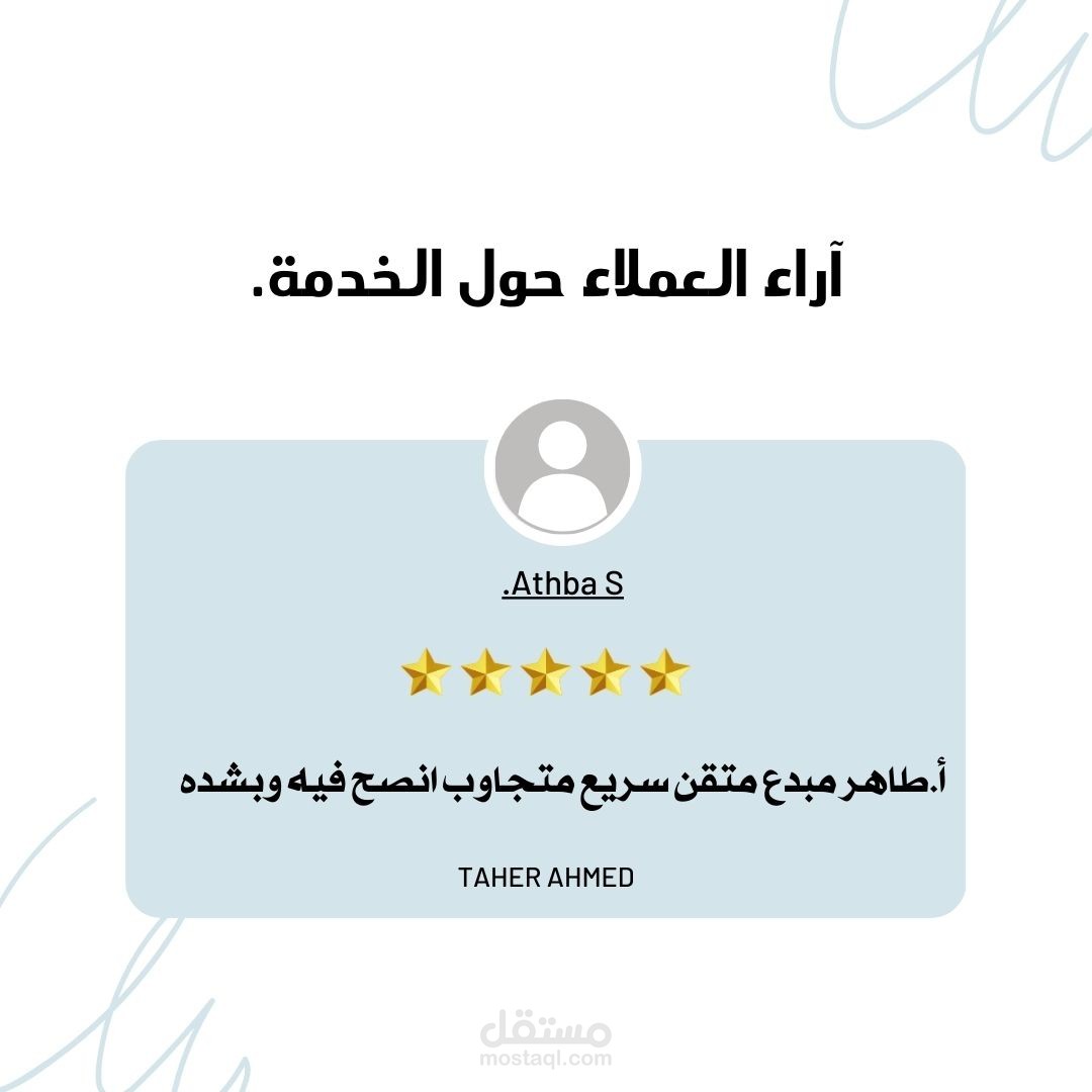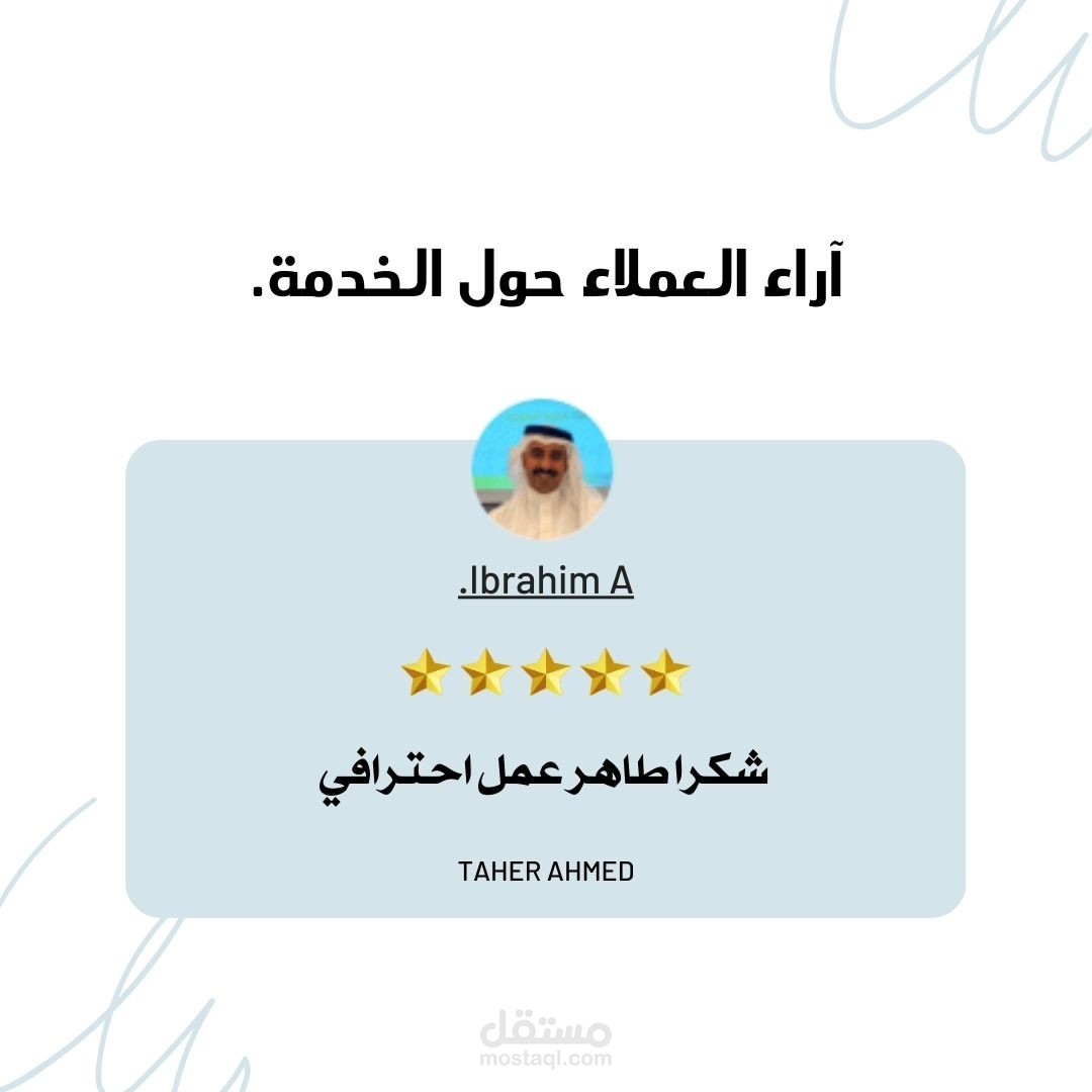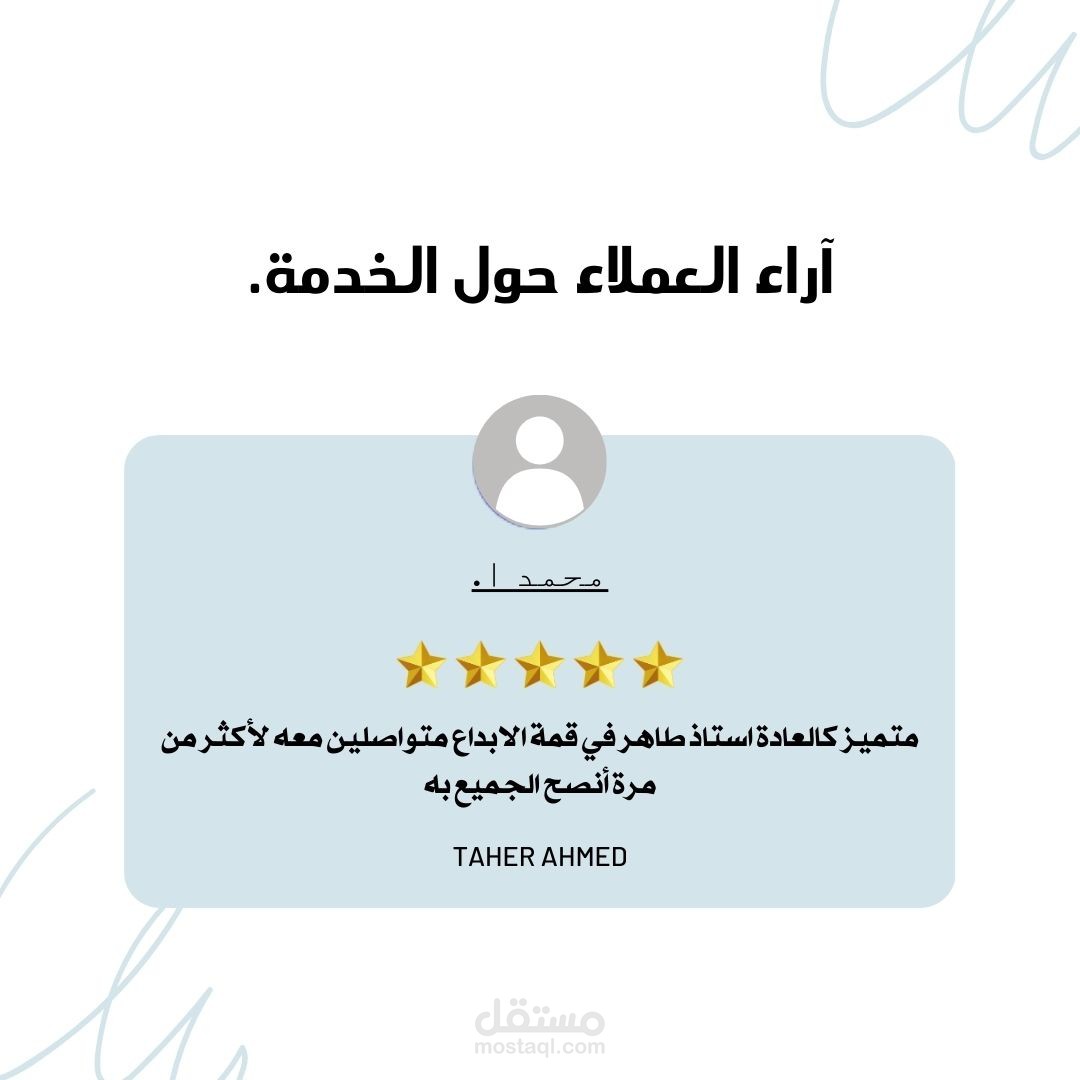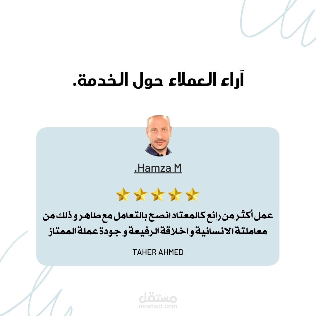 قمت بتصميم العديد من آراء العملاء على منصات متعددة لعرض جودة الخدمة التي أقدمها وزيادة ثقة العملاء الجدد. ️