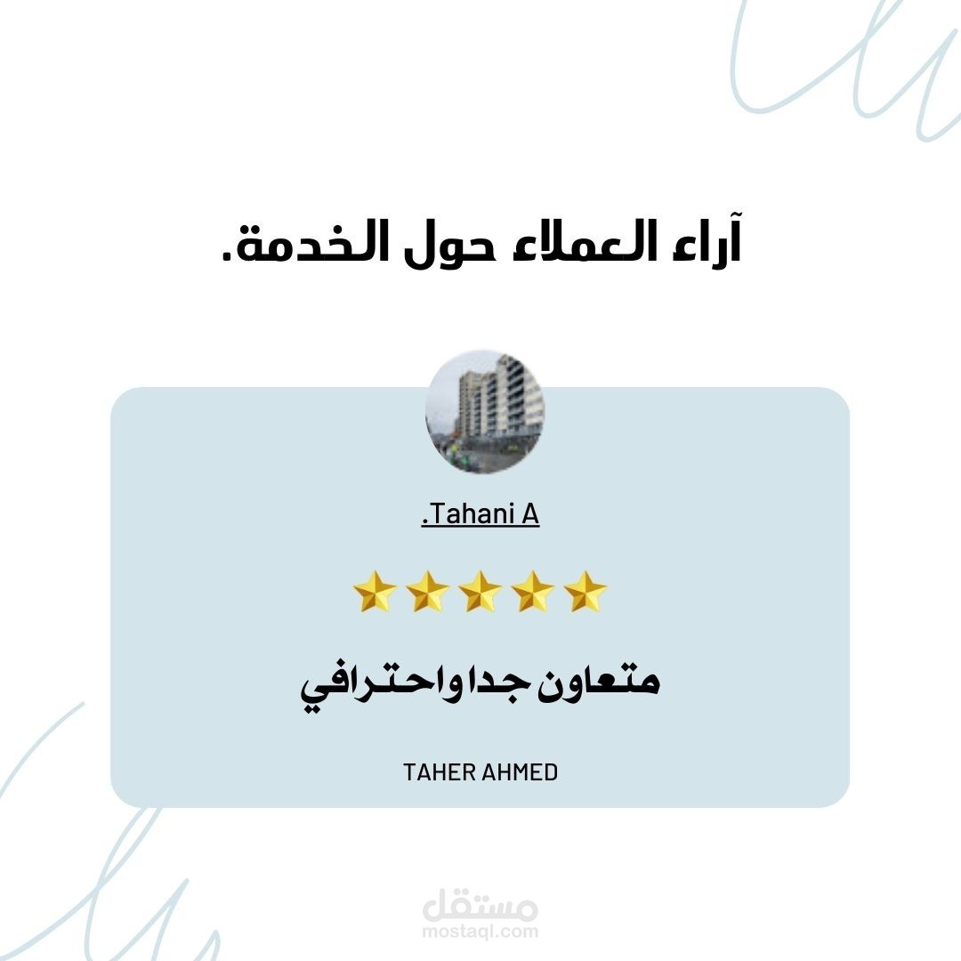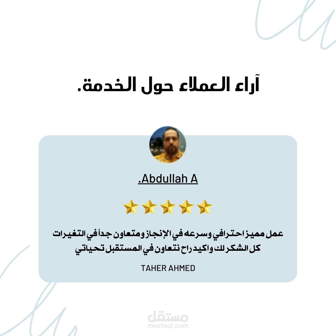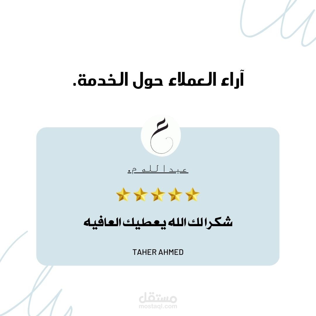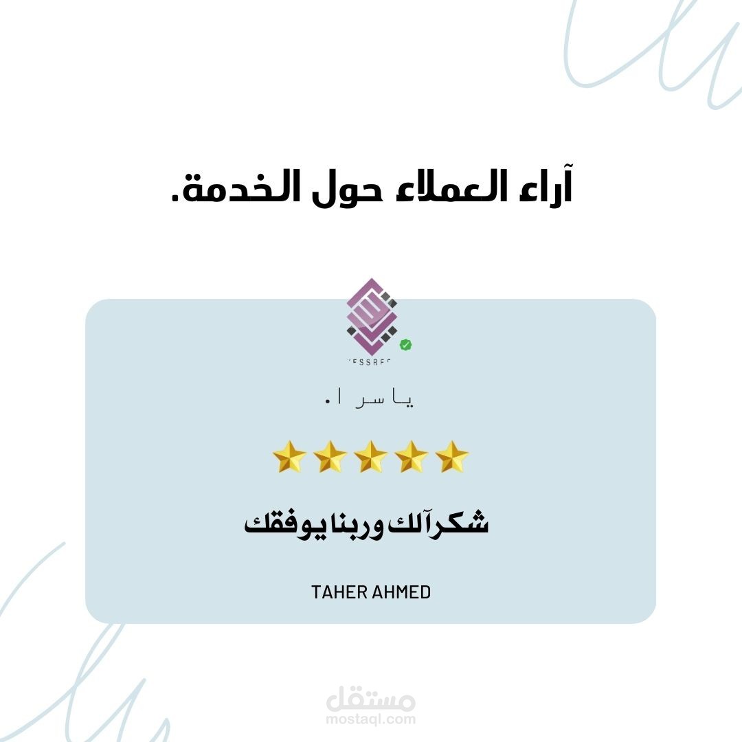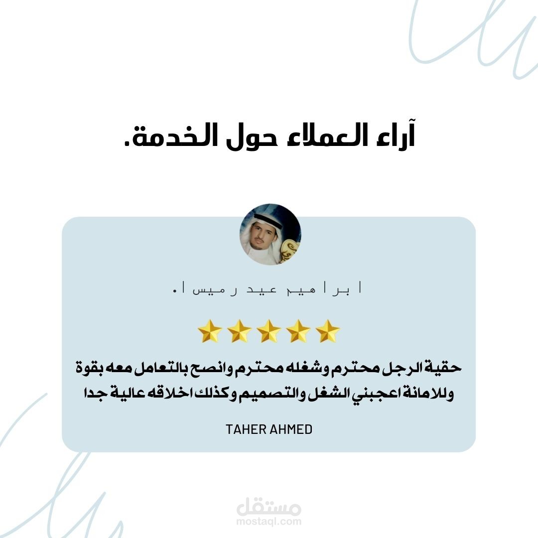 قمت بتصميم العديد من آراء العملاء على منصات متعددة لعرض جودة الخدمة التي أقدمها وزيادة ثقة العملاء الجدد. ️