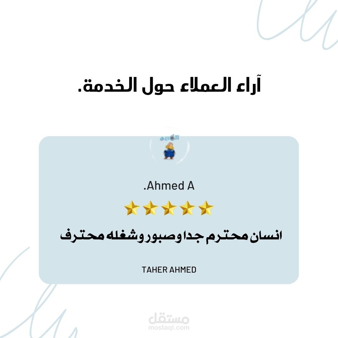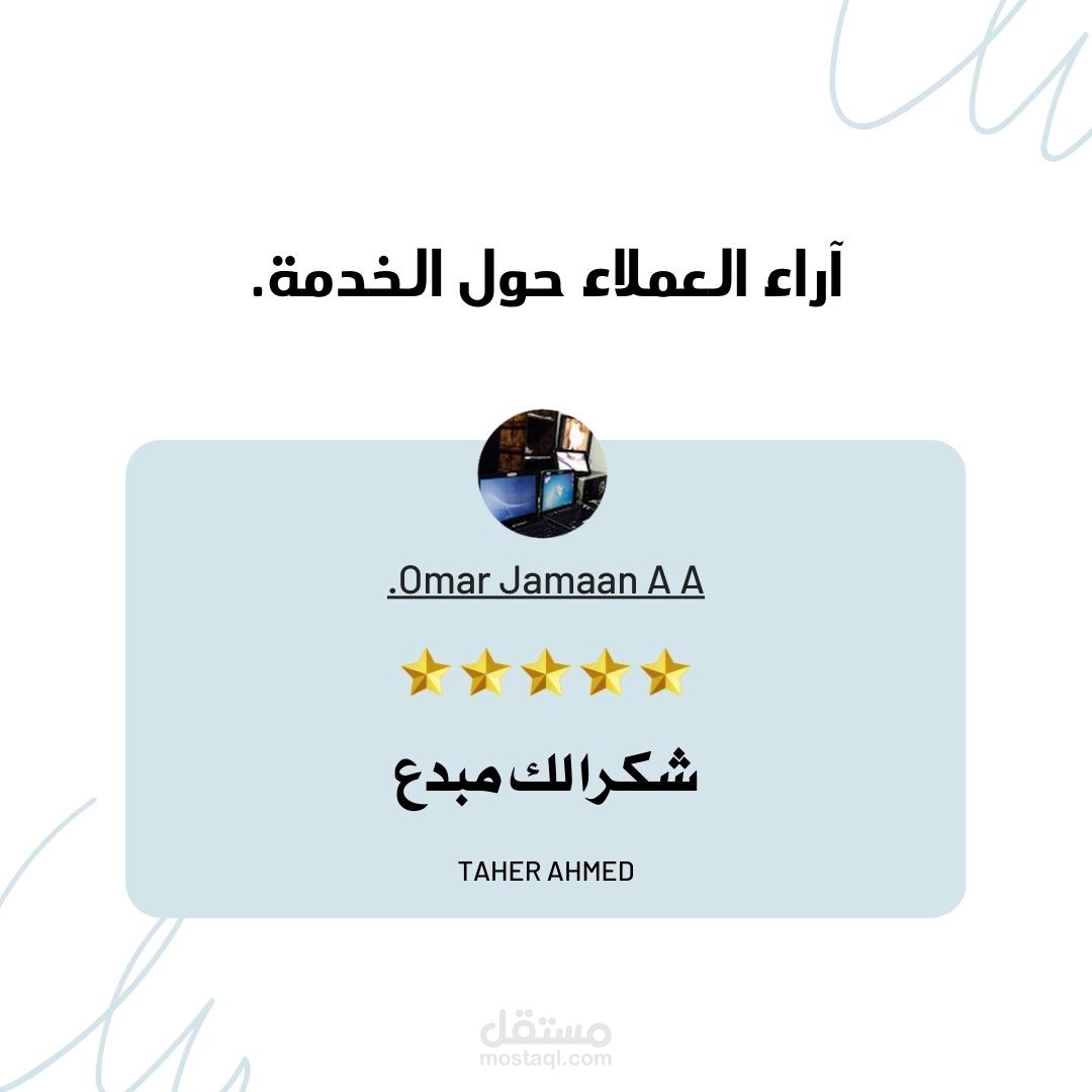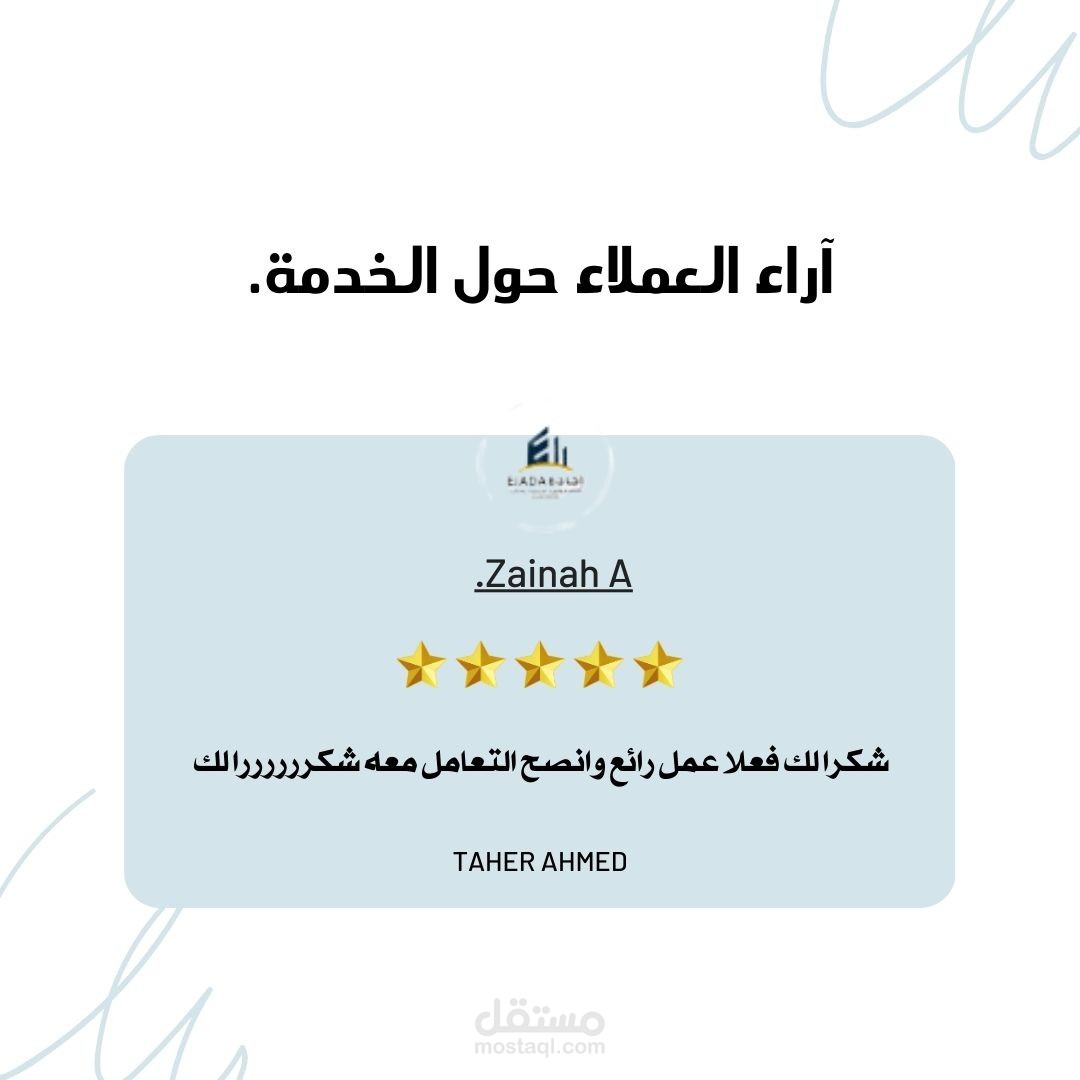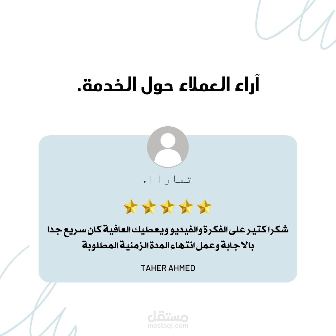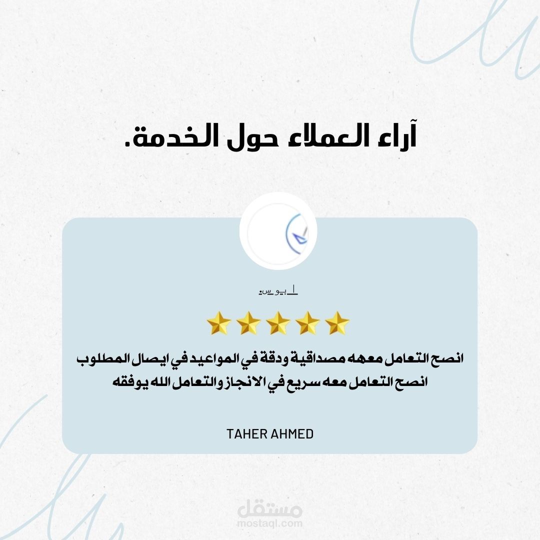 قمت بتصميم العديد من آراء العملاء على منصات متعددة لعرض جودة الخدمة التي أقدمها وزيادة ثقة العملاء الجدد. ️