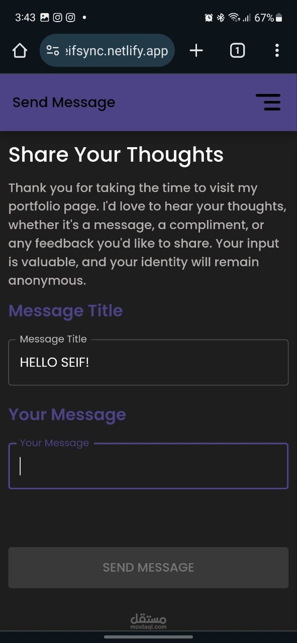 ميزة الاتصال: قسم مدمج للرسائل يتيح للزوار التواصل معي مباشرة.