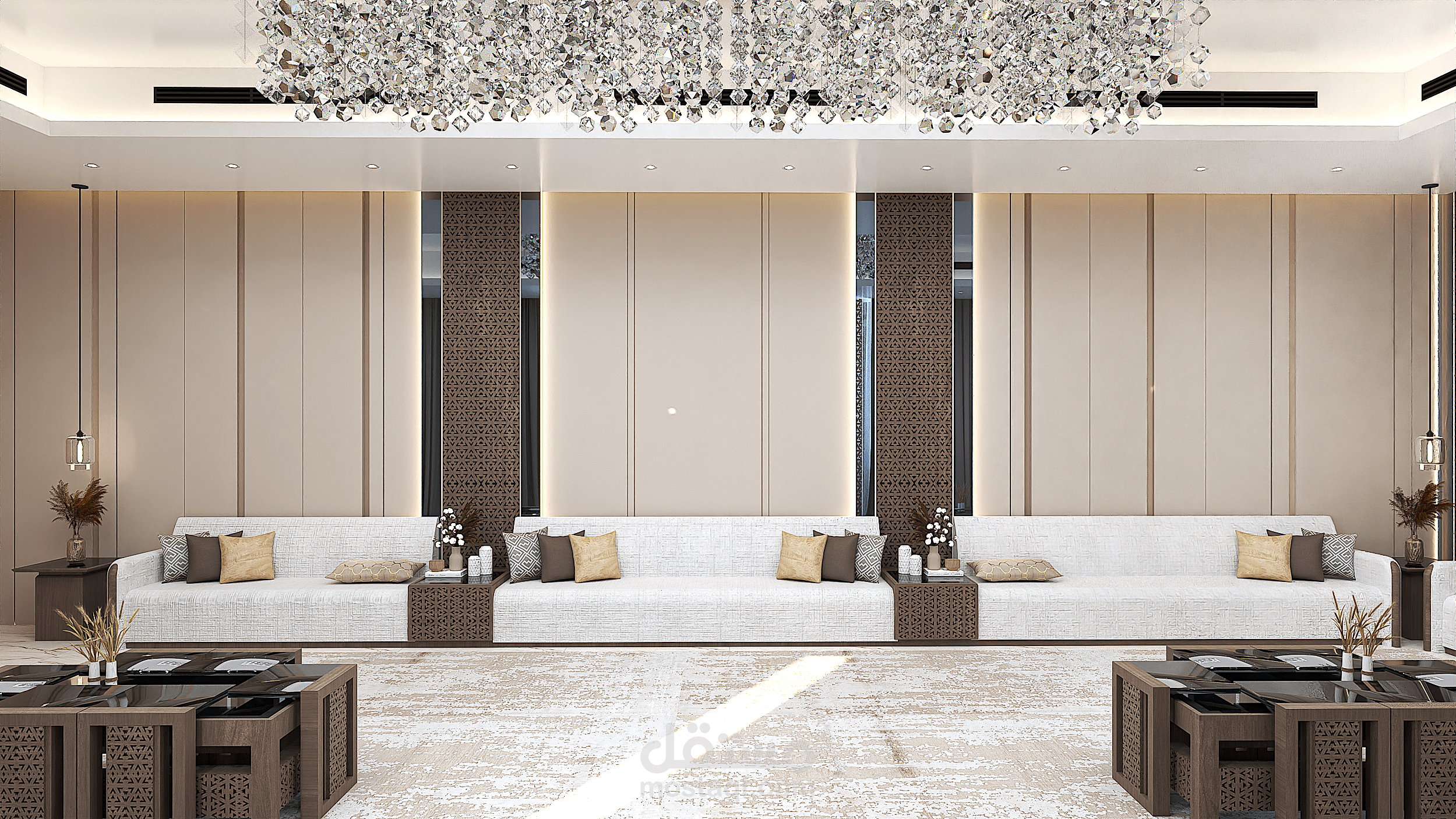 هذا العمل يجسد روح الضيافة العربية المعاصرة، حيث تلتقي الأناقة الهندسية الشرقية مع الحداثة الغربية، مما ينتج عنه مساحة مريحة وفخمة تعكس ذوقًا عاليًا واحترامًا للموروث الثقافي.