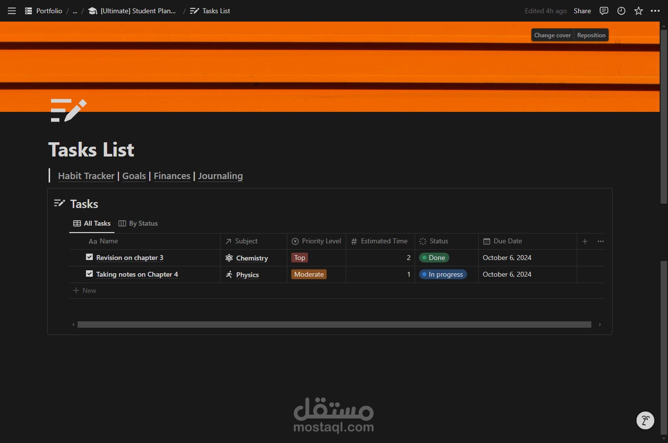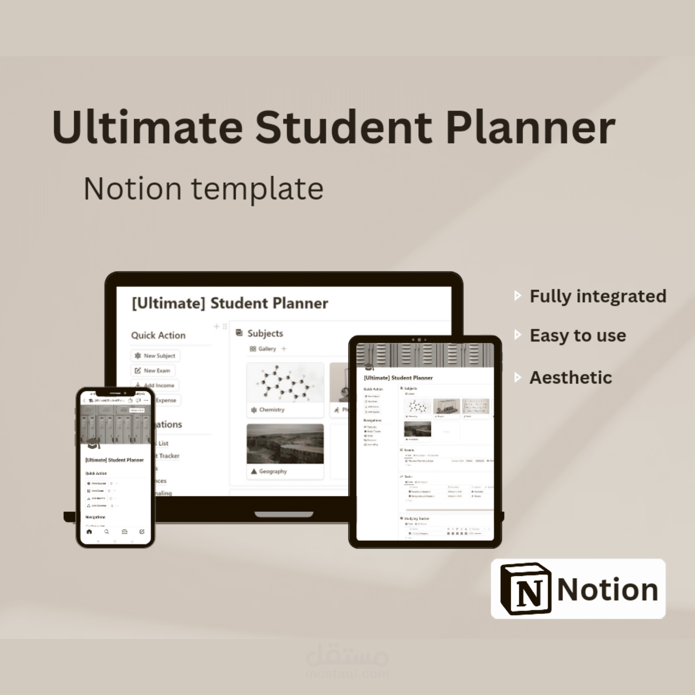 هذا القالب شامل للطلاب مصمم لتبسيط الحياة الأكاديمية، مما يساعدك على البقاء منظمًا ومركزًا ومتحفزًا. يتضمن مجموعة من الميزات لتتبع المواد الدراسية، والمهام، والامتحانات، والمالية، والعادات، والأهداف، والتأملات اليومية، مما يخلق نهجًا شاملاً لحياة الطلاب.