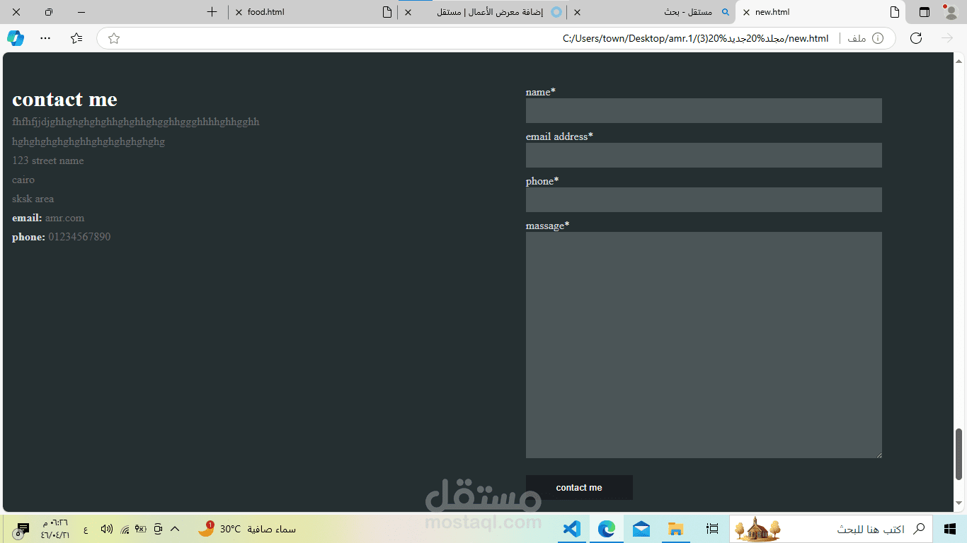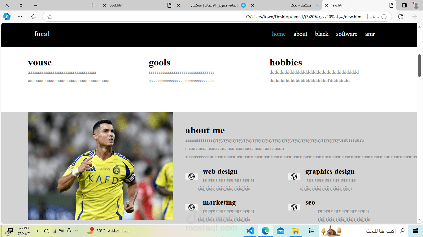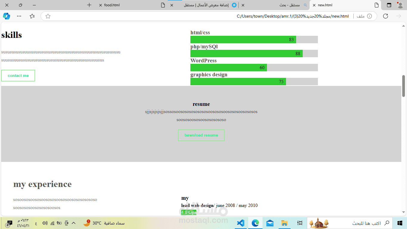 ده اول موقع انشاته لما كنت بتعلم في ال html و ال css وكان الموقع بيتكلم عن wep design بس الموقع انا ما كتبتش في حاجات كثيره وكان الموقع واحد طلبوا مني في خلال ثلاث ايام انا سلمته قبل الموعد المحدد في يومين وكان الموقع بيتكلم عن wep design والاحصائيات و عن اهدافك و انجازاتك وعن شخصيتك اتعلمت في هذا الموقع التصميم الابداعي والكتابه الابداعي وكيف اظبط الصوره و تعلمت كيف اعمل التخطيط البياني ولو اي شخص كان محتاج مساعده كان بيتواصل معايا
