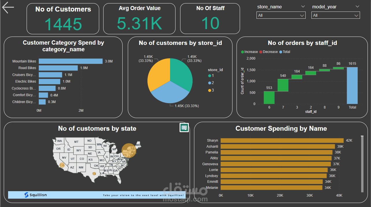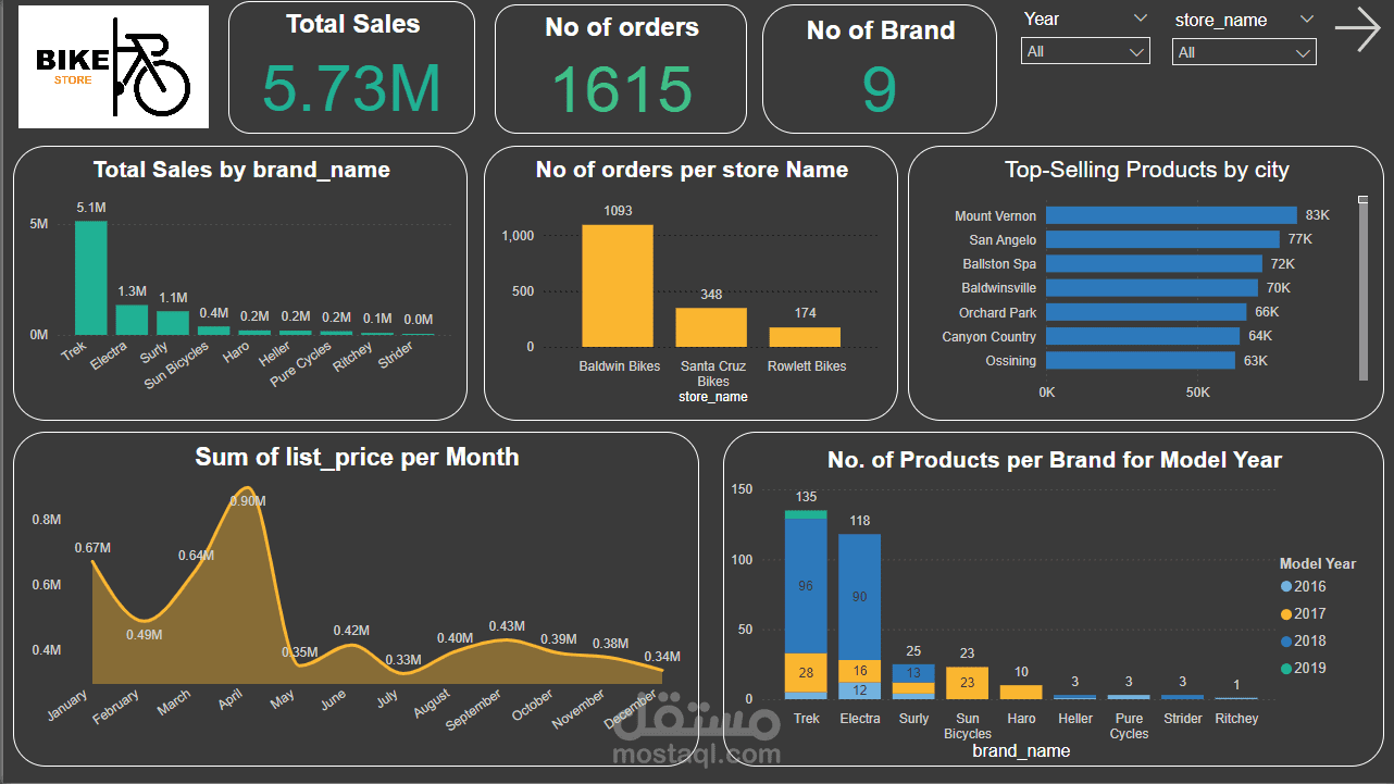 توفر لوحة المعلومات العديد من الرؤى الرئيسية حول أداء مبيعات متجر الدراجات: