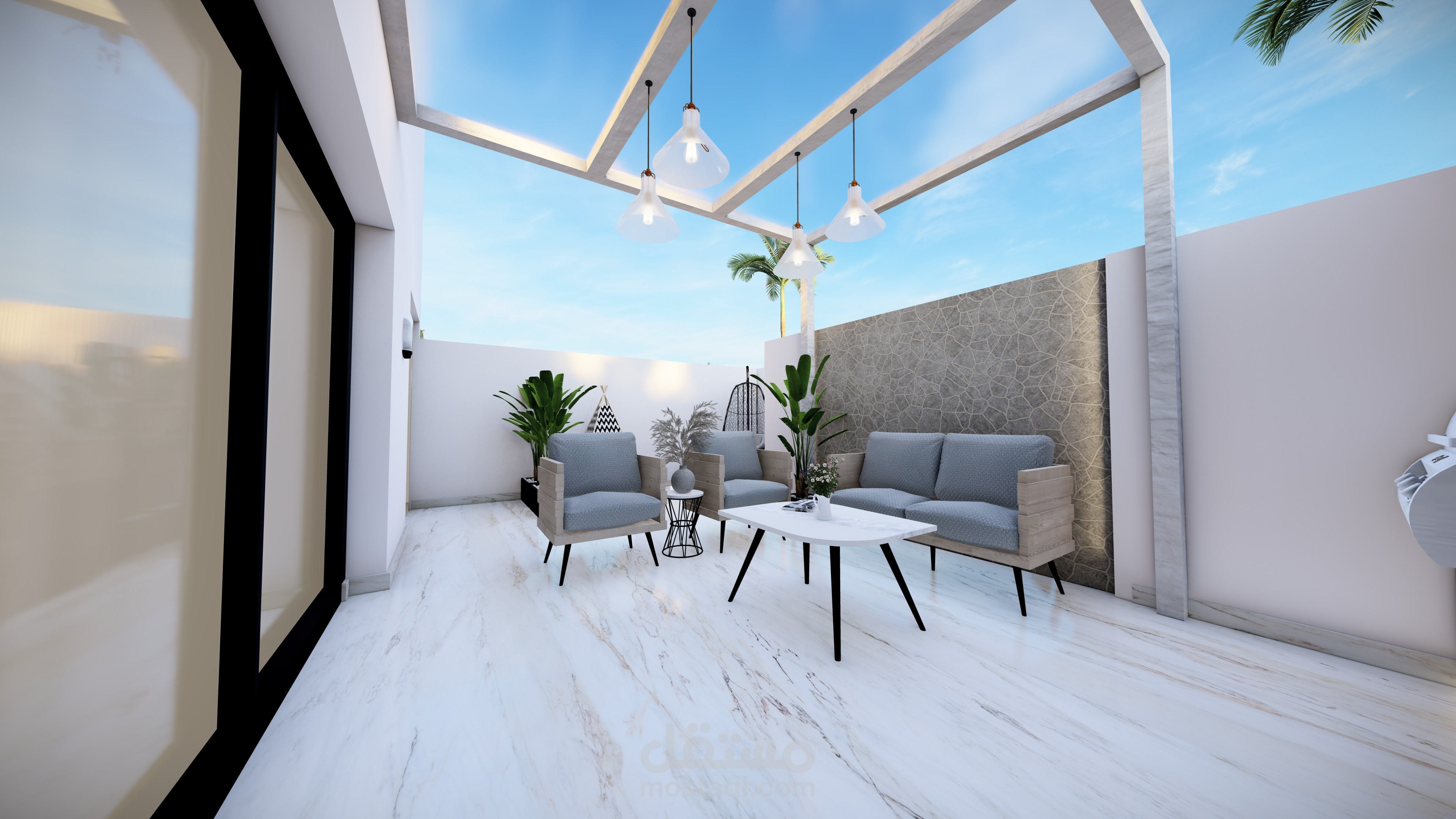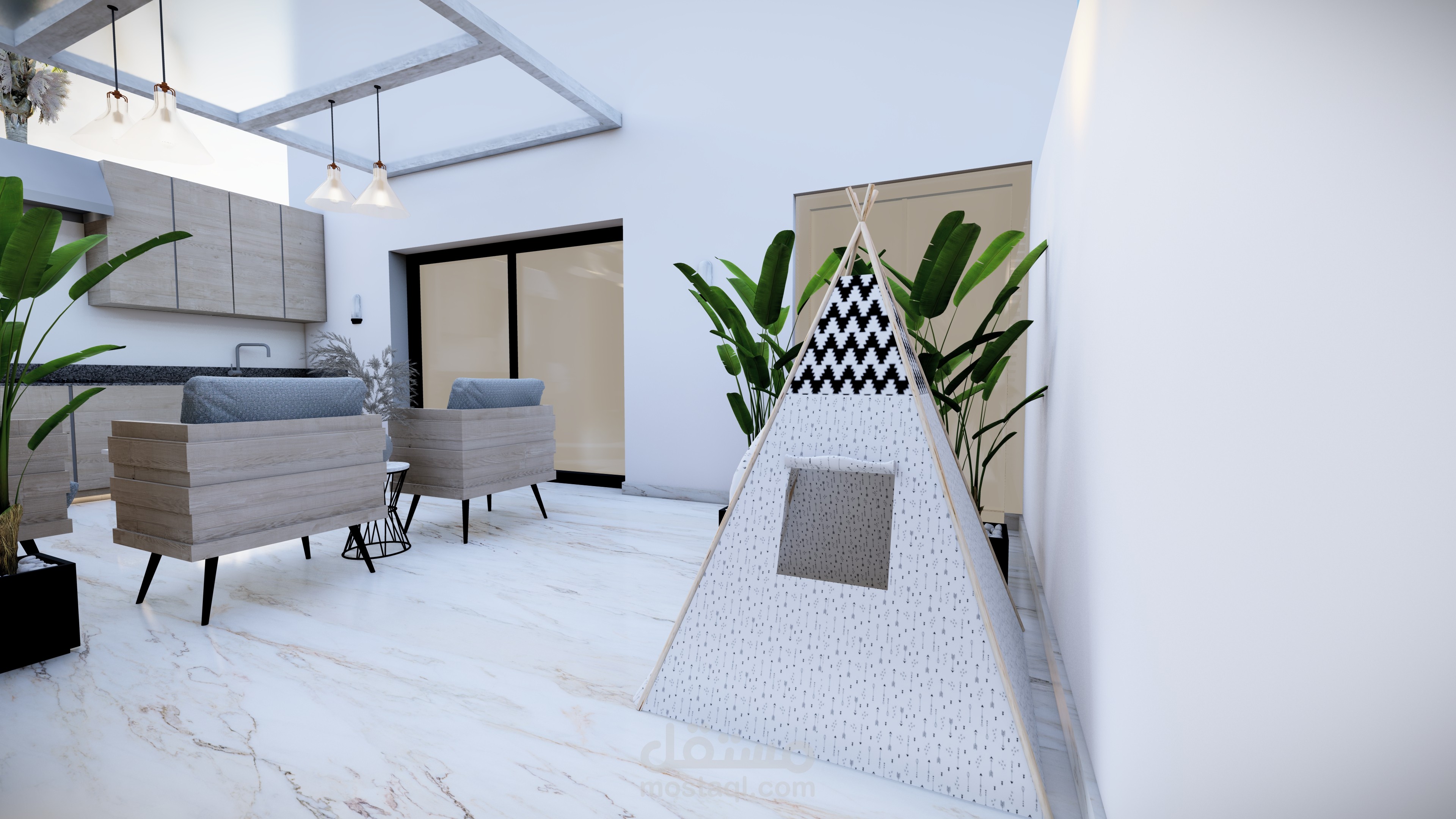 تراس شقة صغير في مدينة الرياض, مع خيمة للتسليه لطفل عمره ثلاث سنوات, يوجد مكان للباربكيو بحيث تراس عائلي, مريح ومكان للاسترخاء.