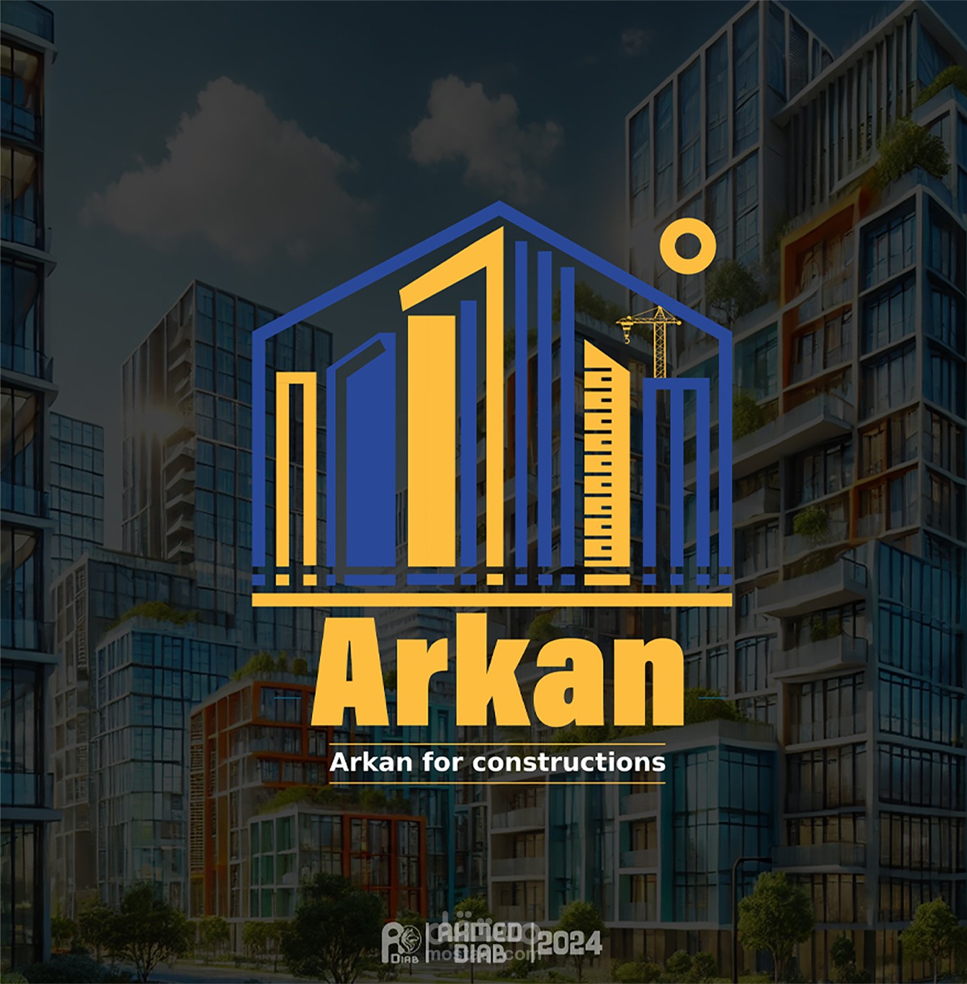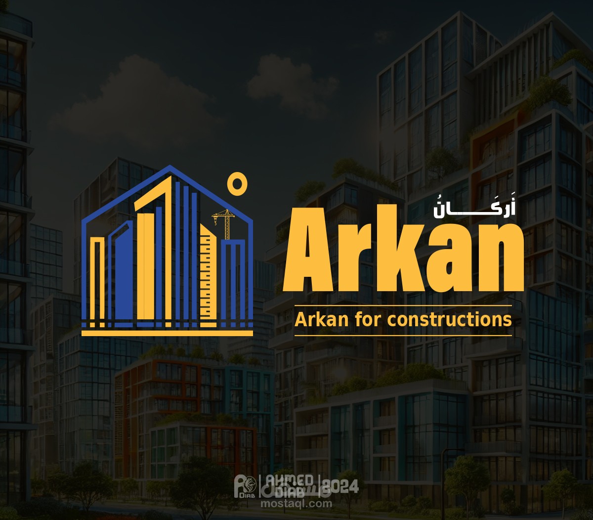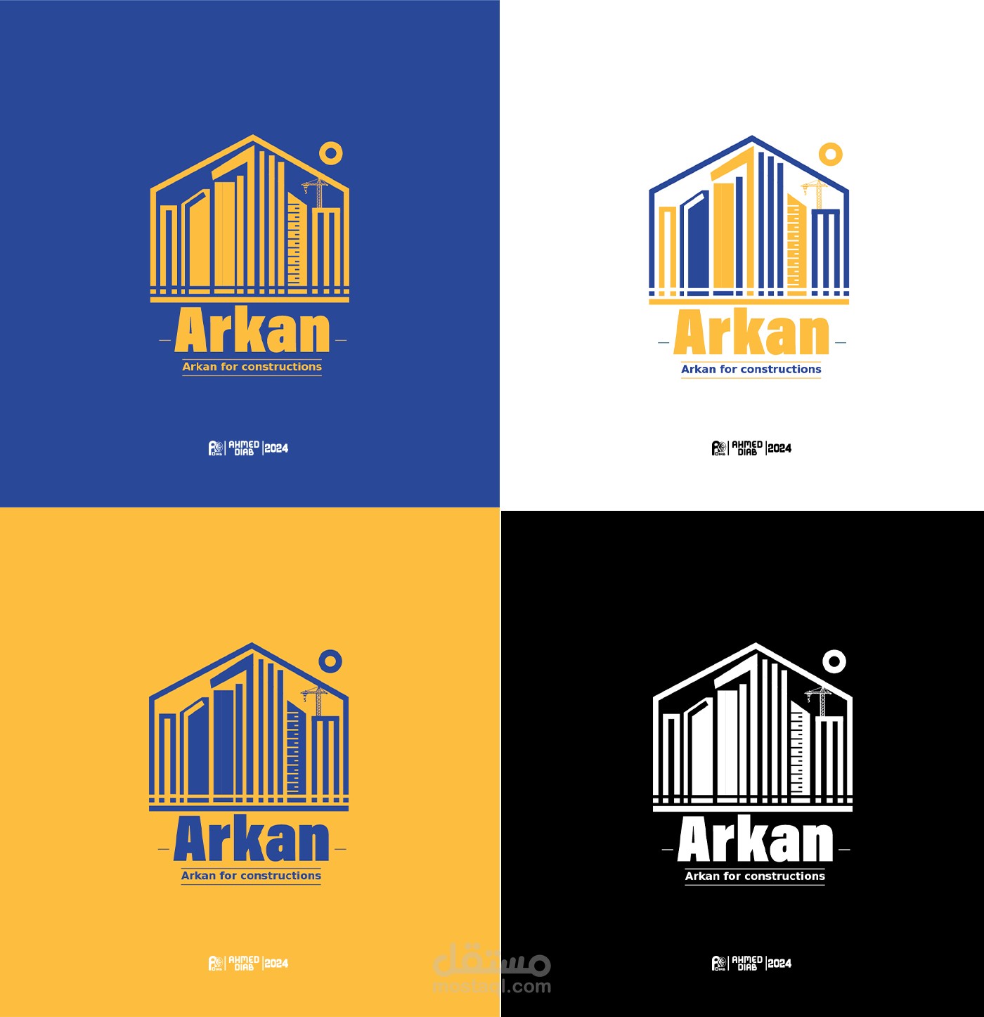 النص السفلي "Arkan for constructions" مكتوب باللون الأزرق، مما يعزز من هوية الشركة ويركز على مجال عملها المتعلق بالهندسة والإنشاءات.