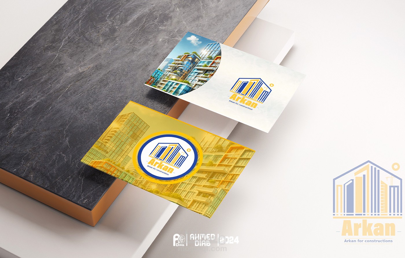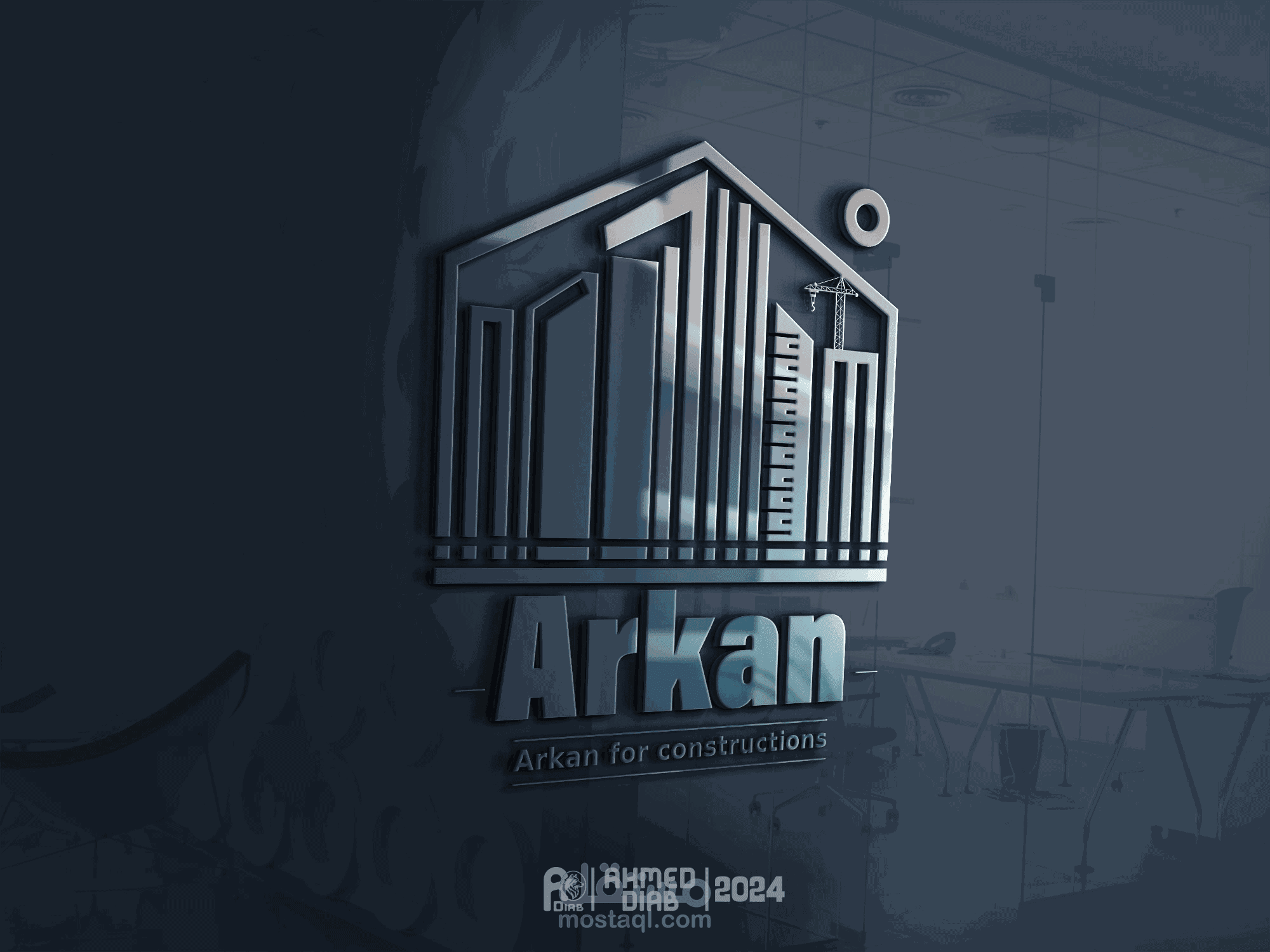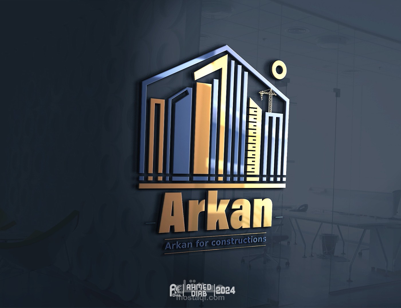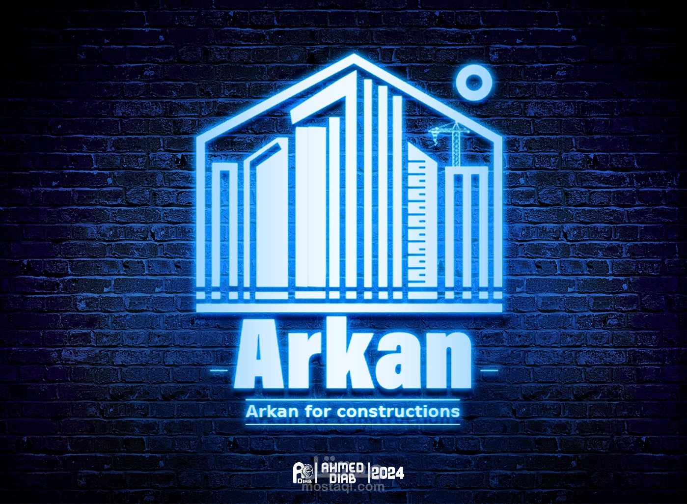 النص السفلي "Arkan for constructions" مكتوب باللون الأزرق، مما يعزز من هوية الشركة ويركز على مجال عملها المتعلق بالهندسة والإنشاءات.