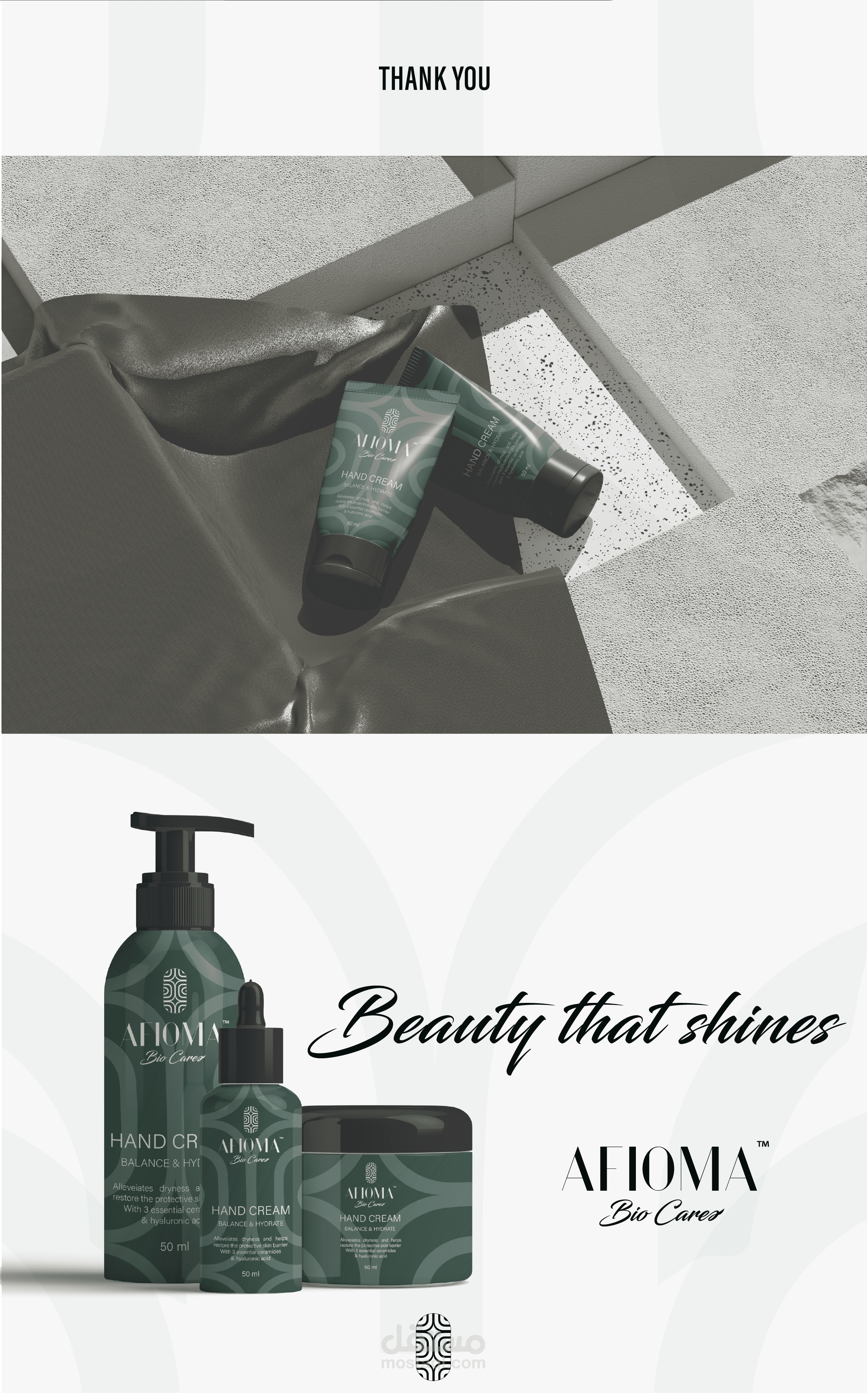 تستحضر AFIOMA إحساسًا بالجمال الطبيعي والثقة البسيطة، مع التركيز على تقديم منتجات خالية من المواد الكيميائية القاسية. تتواصل AFIOMA بصوت واثق، دقيق، وحديث. ترتكز رسالة العلامة التجارية على البساطة، والخلود، وفعالية التركيبات النظيفة.