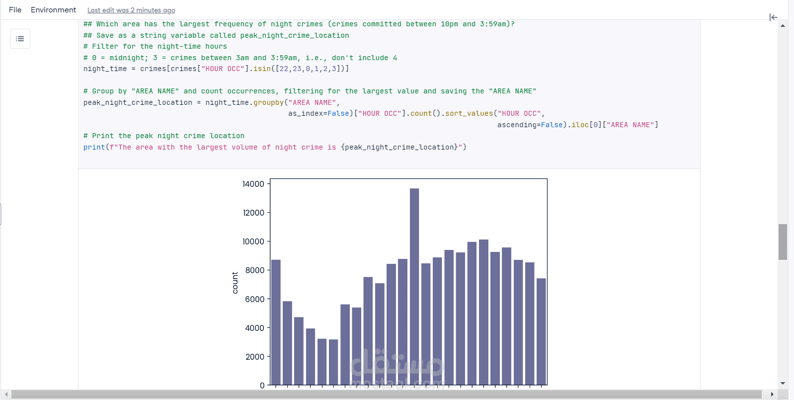 The crimes analyzed occurred between 10 PM and 3:59 AM. Grouping and sorting were done to identify which location had more nighttime crimes and print that for further investigation.