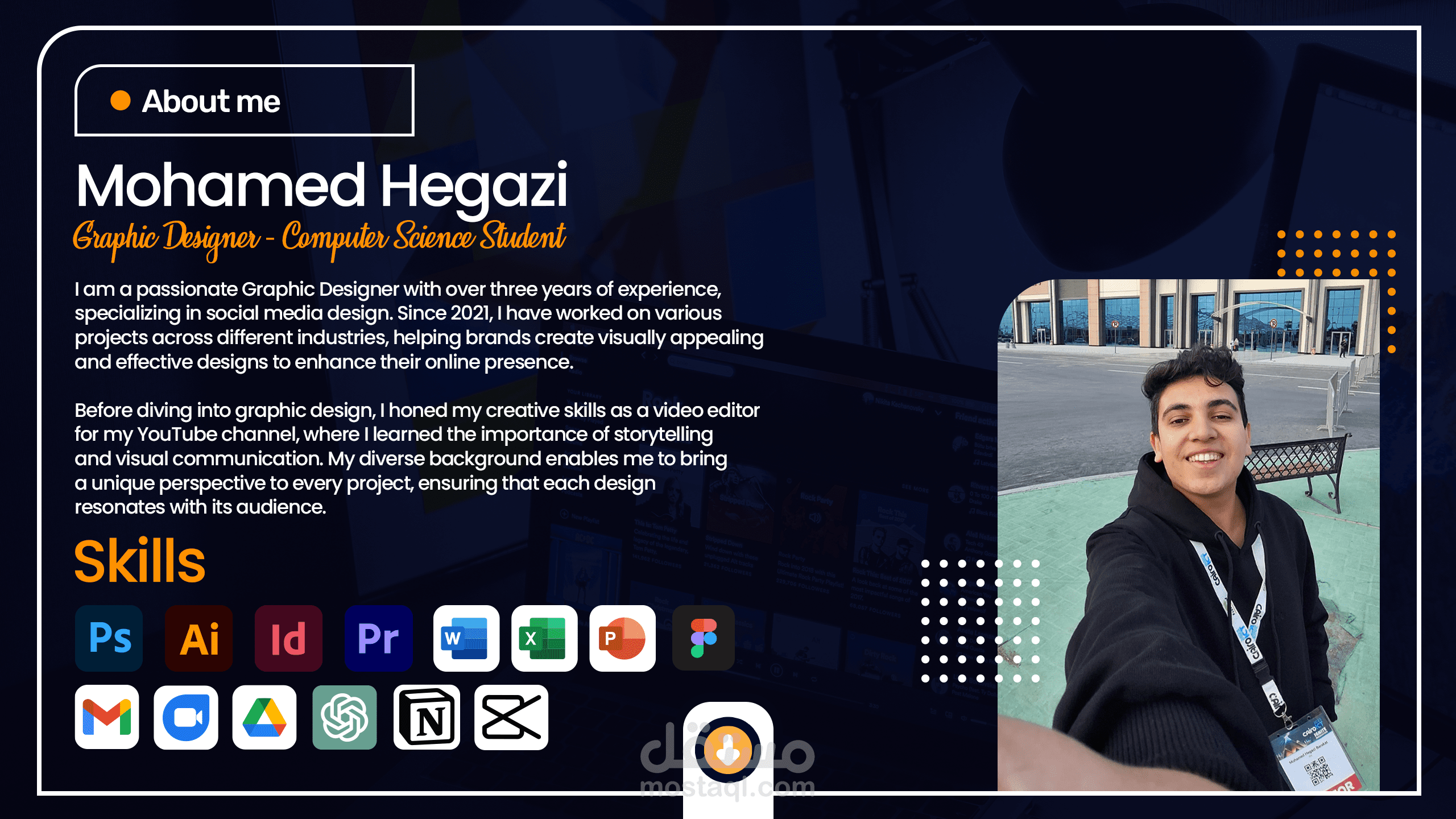 أنا محمد حجازي، مصمم جرافيك بخبرة أكتر من 3 سنوات في تصميم المواد الدعائية والمرئية المميزة. اشتغلت مع براندات محلية متنوعة وقدمت حلول تصميمية بتساعدهم على توصيل رسالتهم بشكل إبداعي وجذاب.