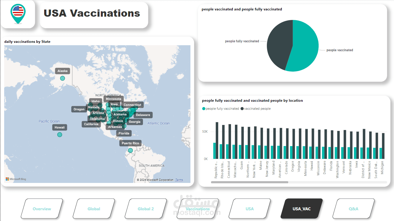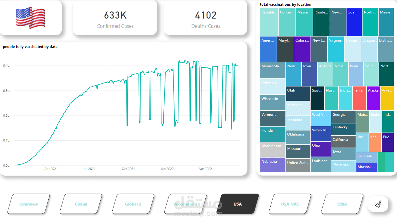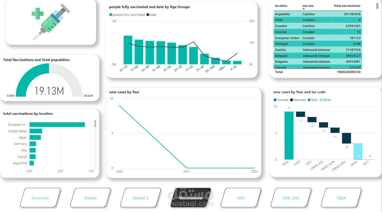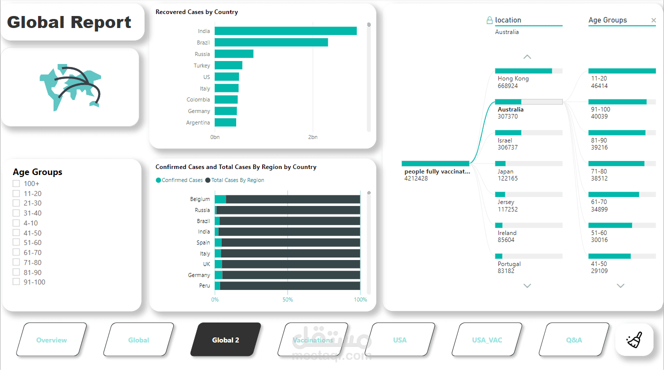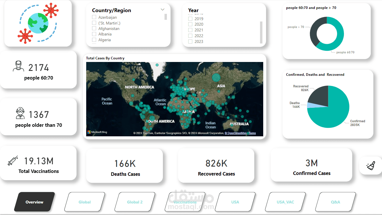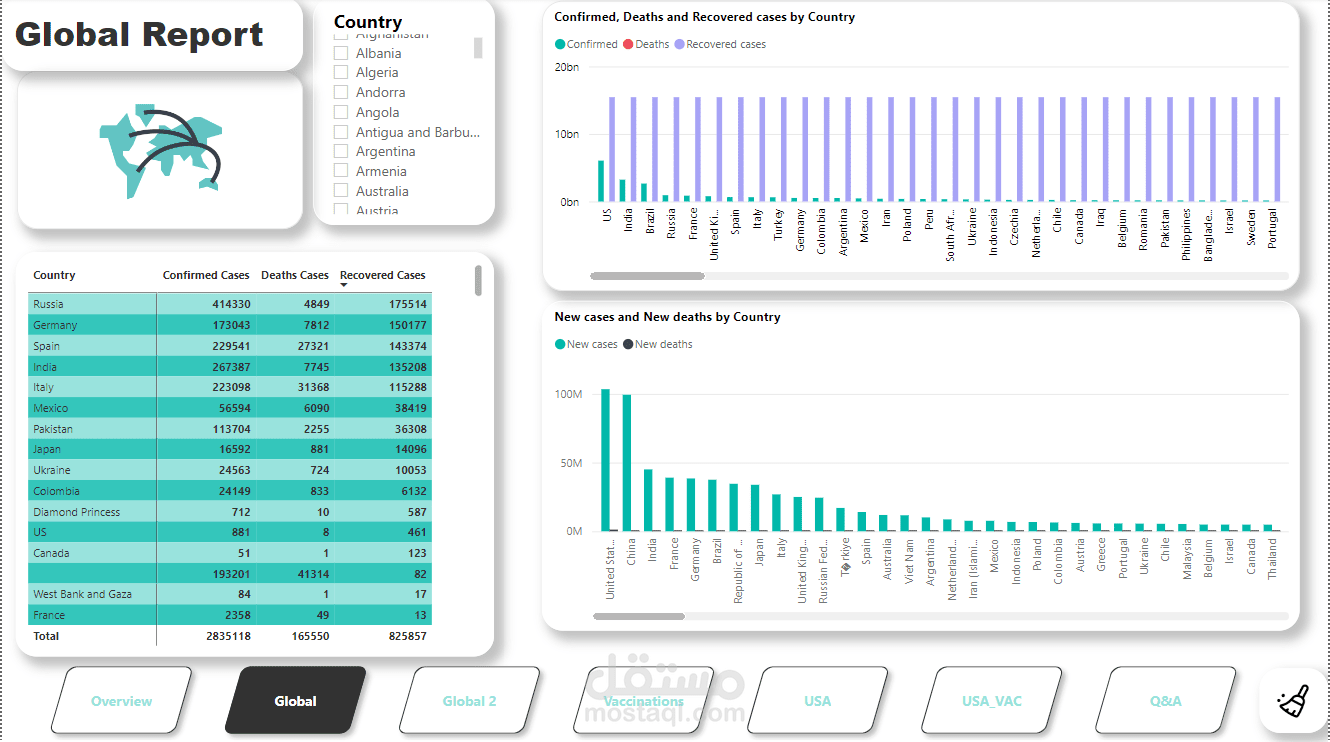 قمت بتطوير مشروع لوحة تحكم تفاعلية باستخدام Power BI لتقديم تقرير عالمي شامل عن جائحة كورونا (COVID-19). المشروع يغطي الإحصائيات الرئيسية مثل الحالات المؤكدة، الوفيات، التعافي، وبيانات التطعيم في مختلف البلدان والمناطق.