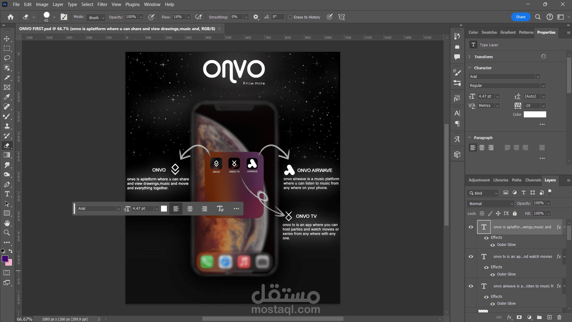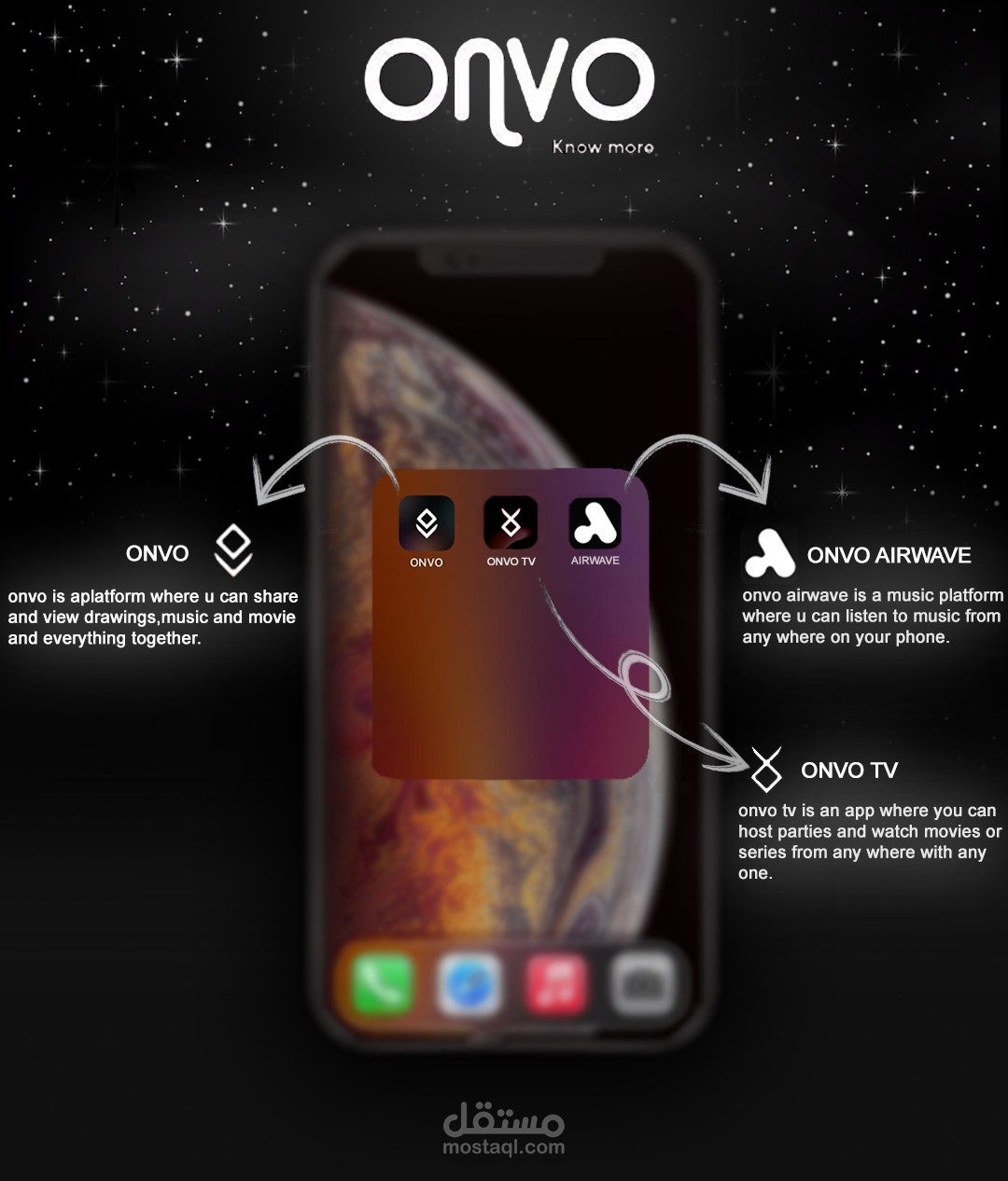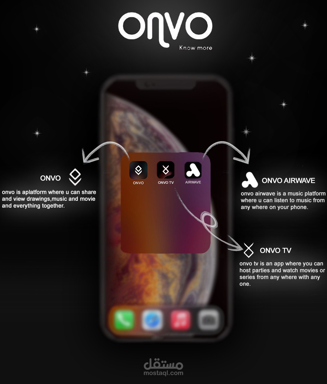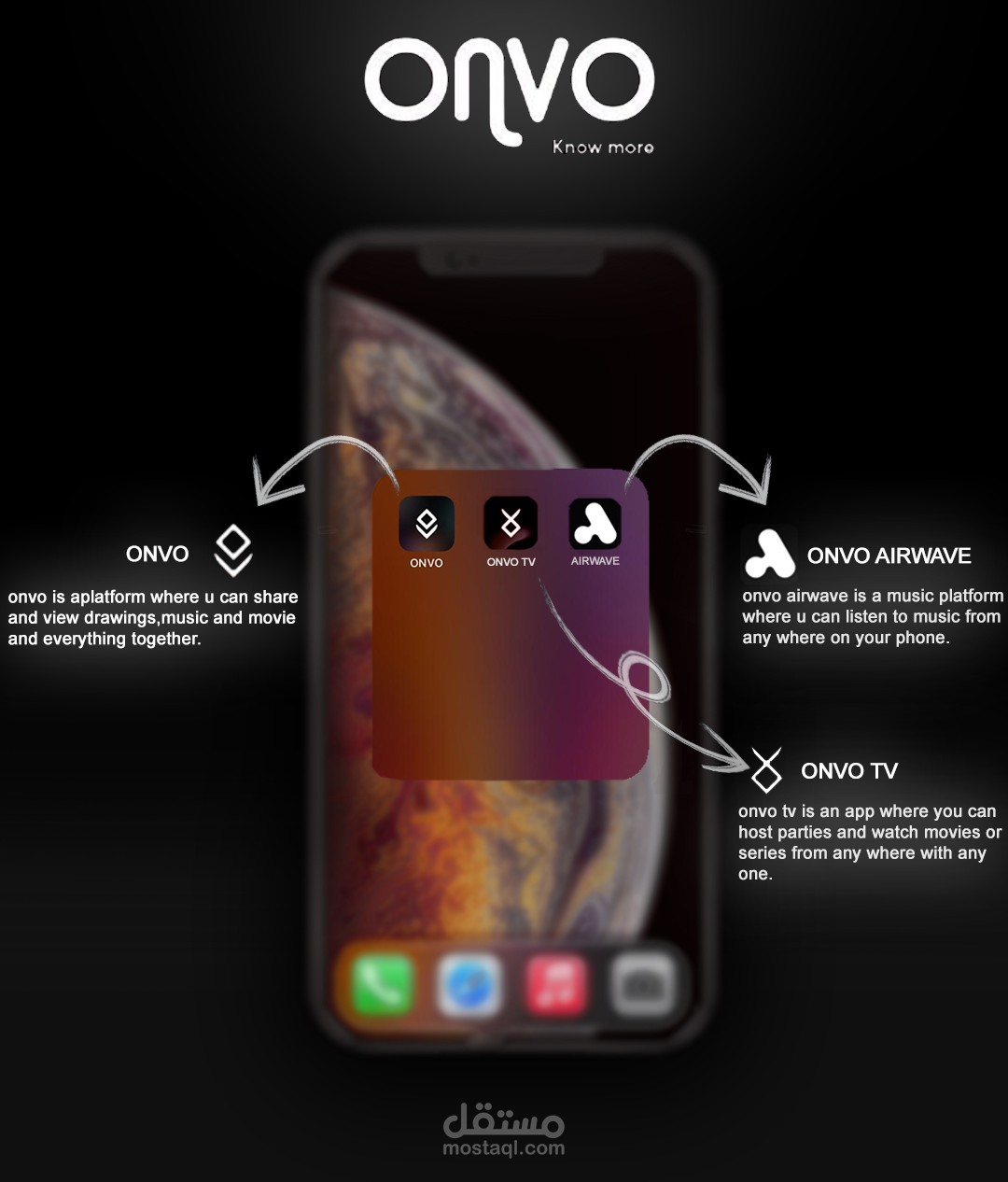 التصميم يعكس روح الابتكار والتواصل اللي بتميز تطبيقات "ONVO"، وبيبرز سهولة الاستخدام وتعدد الوظائف اللي بتقدمها