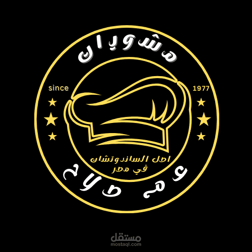 شعار مطعم المشويات يتميز بتصميم عصري وأنيق، حيث يُستخدم خلفية باللون الأسود تضفي عمقاً وجاذبية على الشعار. يتوسط الشعار رسم لقبعة الشيف، مما يعكس الاحترافية والمهارة في فن الطهي. جميع الخطوط في الشعار تُستخدم باللون الأصفر، مما يخلق تبايناً قوياً مع الخلفية السوداء، ويعكس الحيوية والطاقة. هذا التصميم يجمع بين الأصالة والحداثة، مما يجعل الشعار جذاباً ويسهل تذكره
